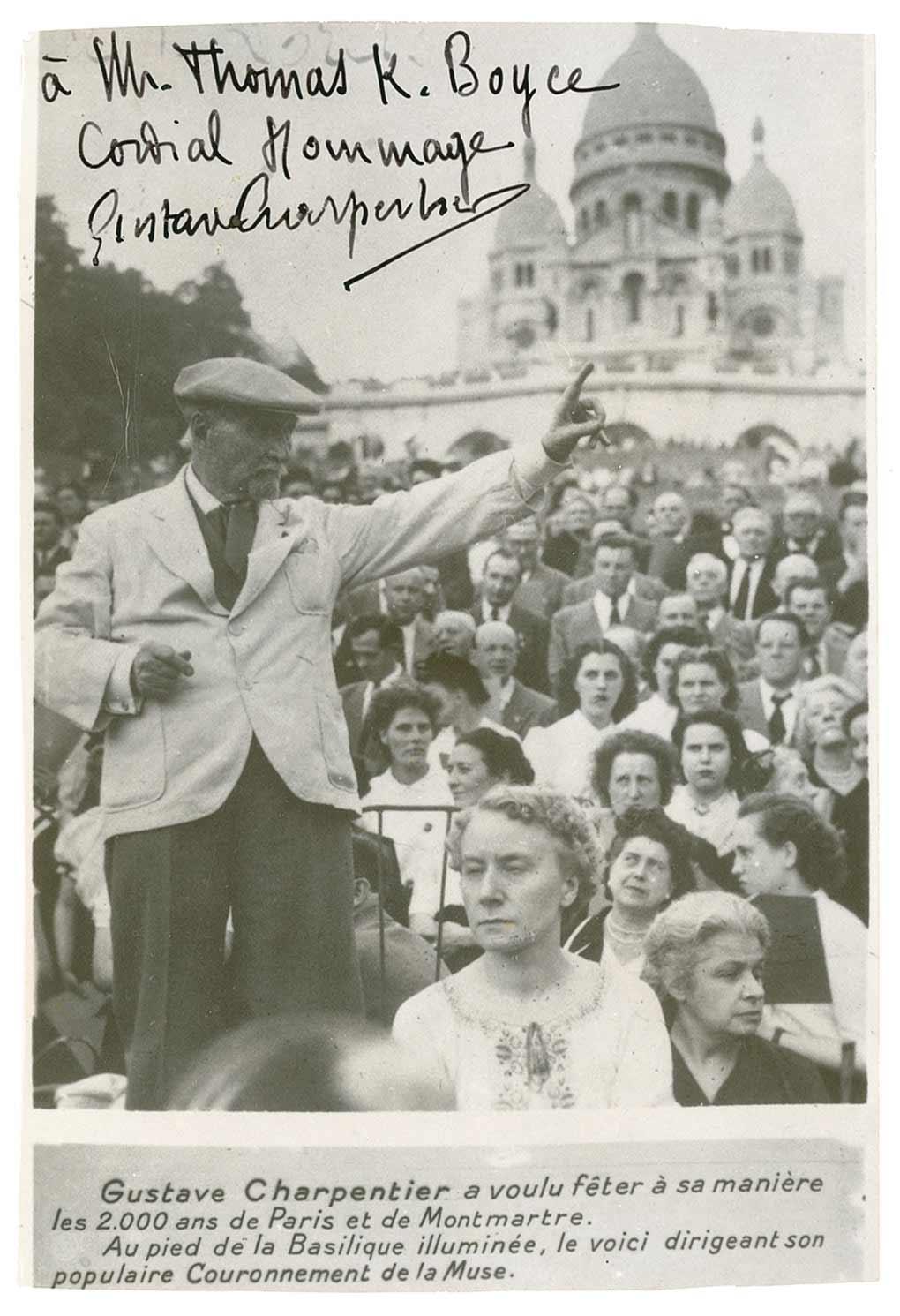 He founded a free school of music for the poor, the Conservatoire Populaire de Mimi Pinson, wrote dramatic and choral works, and composed both the music and libretti for the operas Louise and Julien. AMQS on the reverse of a vintage 5.5 x 4 glossy photo of Charpentier. The composer pens four bars of music and lyrics from his opera Louise, signing underneath, “Gustave Charpentier 2/62.” Charpentier has also signed and inscribed the image side of the photo. Accompanied by the original mailing envelope. A bit of scattered light soiling to quote side, trimmed edges, and light creasing and surface marks to image side, otherwise fine condition.