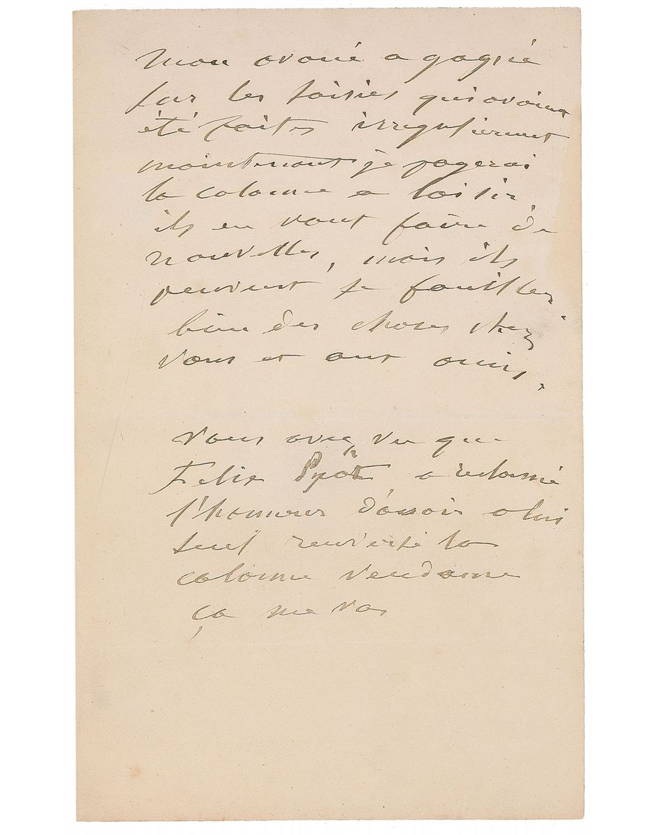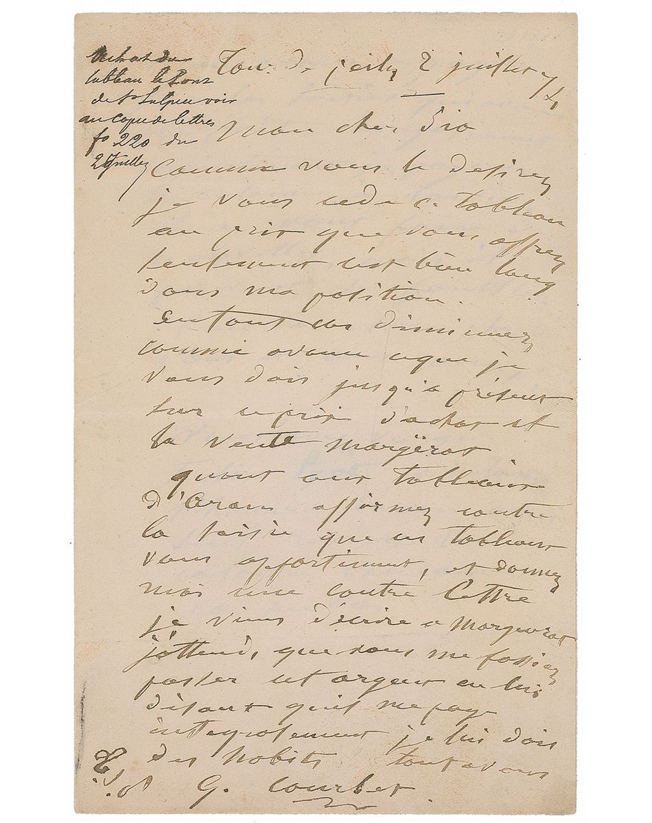 French painter (1819–1877) who was scorned for his rigid classical outlook. He was imprisoned and fined for his part in the destruction of the Vendome Column and later fled to Switzerland. ALS in French, signed “G. Courbet,” two pages on two adjoining sheets, 5.25 x 8.5, July 2, 1874, Tour de Peilz [Switzerland]. Letter to friend and dealer Paul Pia, in full (translated): “As you wish I am giving you this painting at the price that you offer but it is rather long in my situation. Above all to reduce as an advance what I owe you up to now on that purchase cost and on the Margërot sale. Concerning the Oran painting assert against seizure that you own this painting, and give me a letter in exchange. I just wrote to Margerot, I wait until you have this money brought to me while I am telling him that he pays me integrally. I owe him clothing. My lawyer won on the seizures that had been done dubiously now I will pay the column at my leisure, they are going to make new ones, but they can search many things at your house and ones of friends. You saw that Felix Pyat has restored honors by knocking over the Vendome Column on his own it is fine with me.” A short ink notation in another hand is written at the top of the first page, indicating that the letter regards “purchase of painting the Bridge of St. Sulpice…fr[ancs] 220 or 27 thousands.” In fine condition, with a bit of scattered light toning and foxing.
