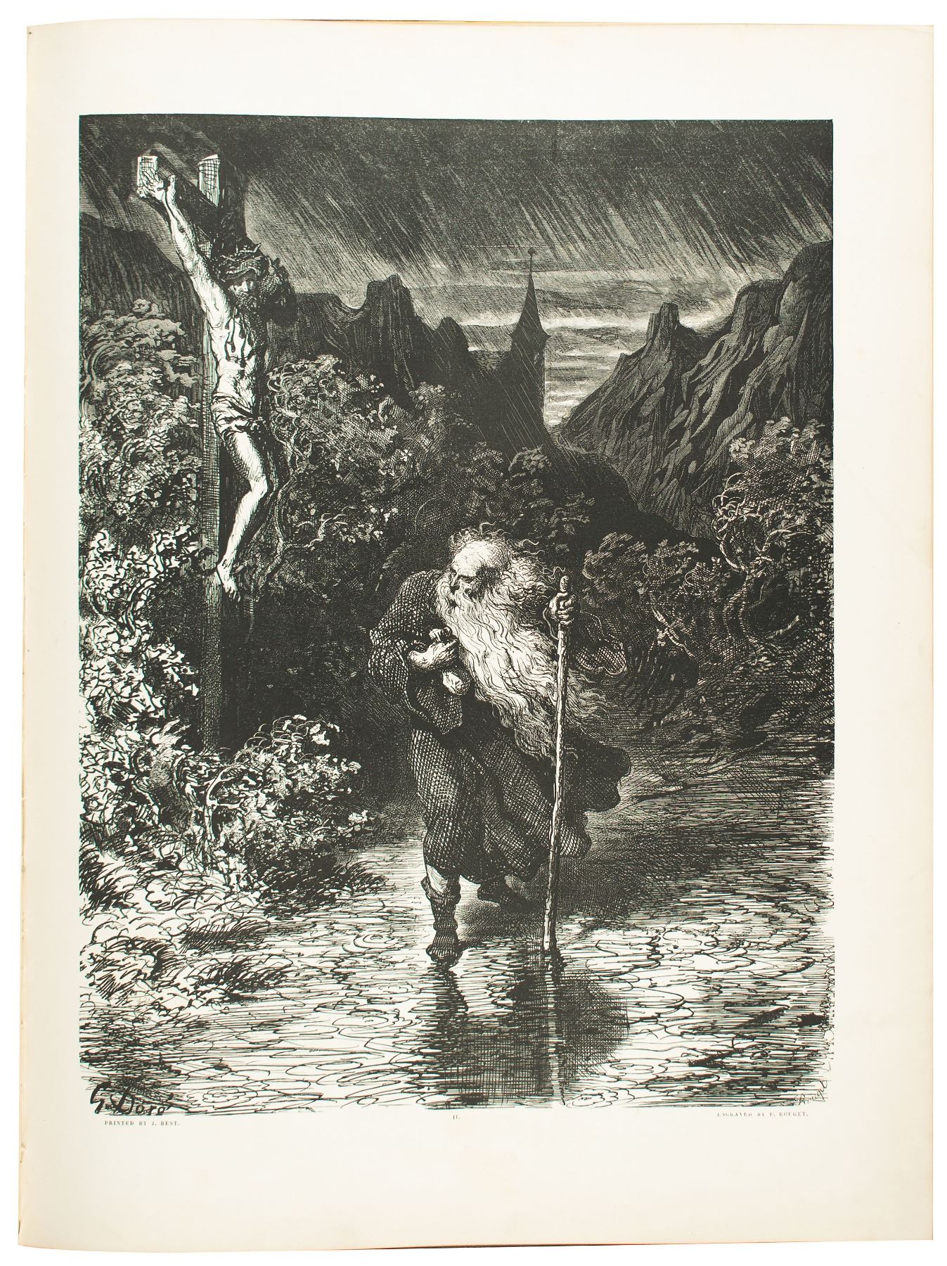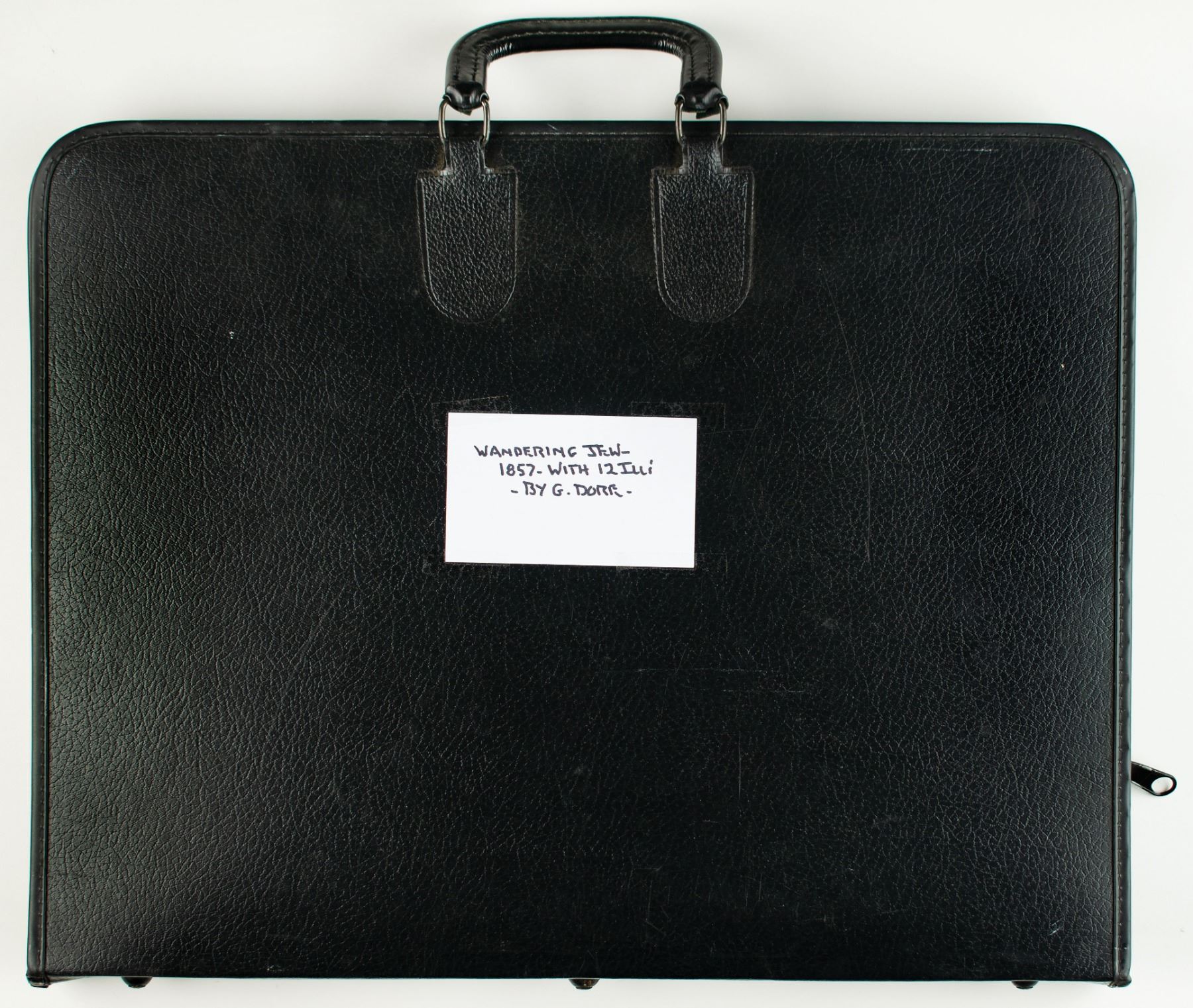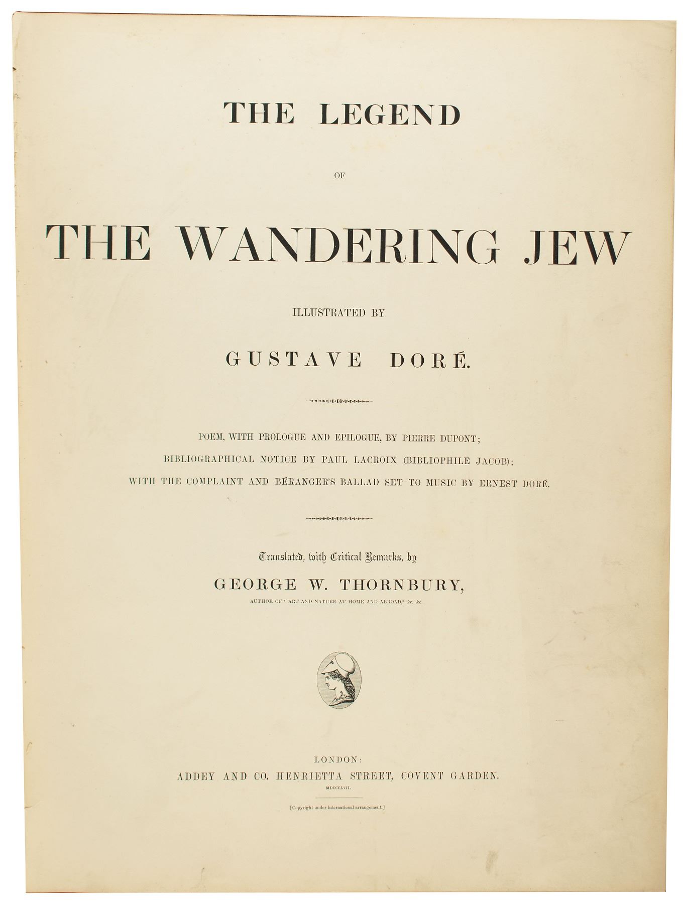 Large unsigned book: The Legend of the Wandering Jew, translated by George W. Thornbury and illustrated by Gustave Dore. First edition. London: Addey and Co., 1857. Hardcover bound in green cloth with all edges gilt, 15 x 20, 83 pages. Complete with its twelve impressive engraved plates by Dore. In very good to fine condition.