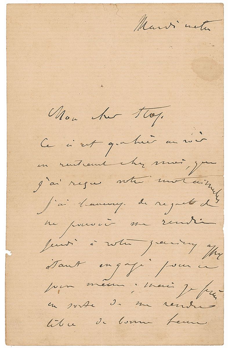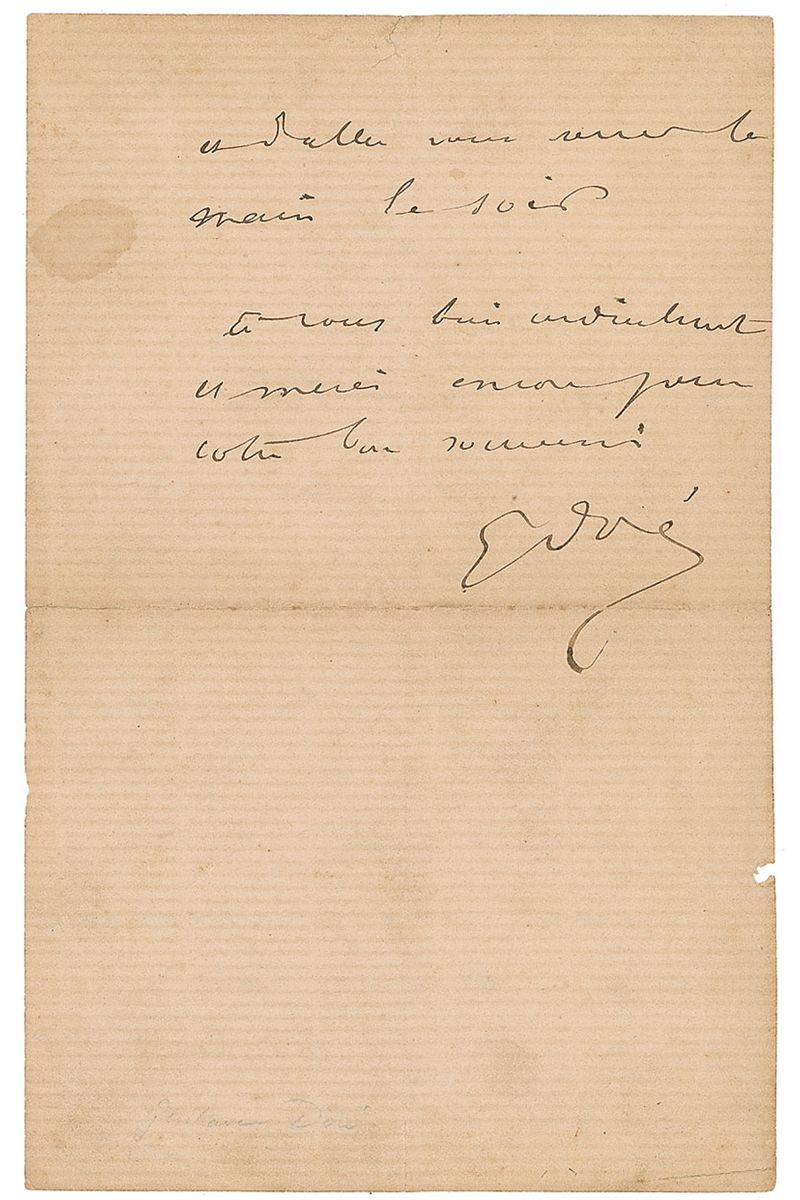 Painter and illustrator (1832–1883) known for his illustrated editions of books by Rabelais, Balzac, Dante, Milton, and others. Untranslated ALS in French, signed “G. Dore,” one page both sides, 5 x 8, no date. In very good condition, with light scattered soiling, a circular stain to the upper right (affecting no text), and a few small edge chips and tears.