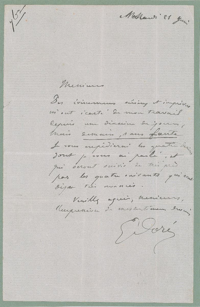 Untranslated ALS in French, signed “G. Dore,” one page, 5.25 x 8, June 21, no year. Affixed at corners to a slightly larger sheet. In fine condition.