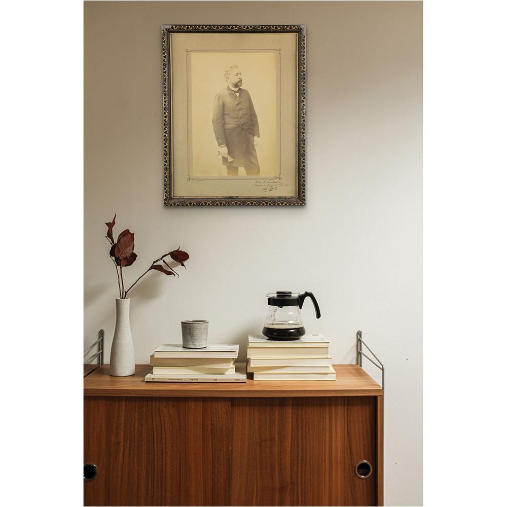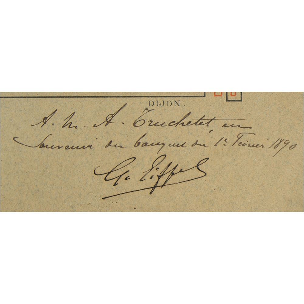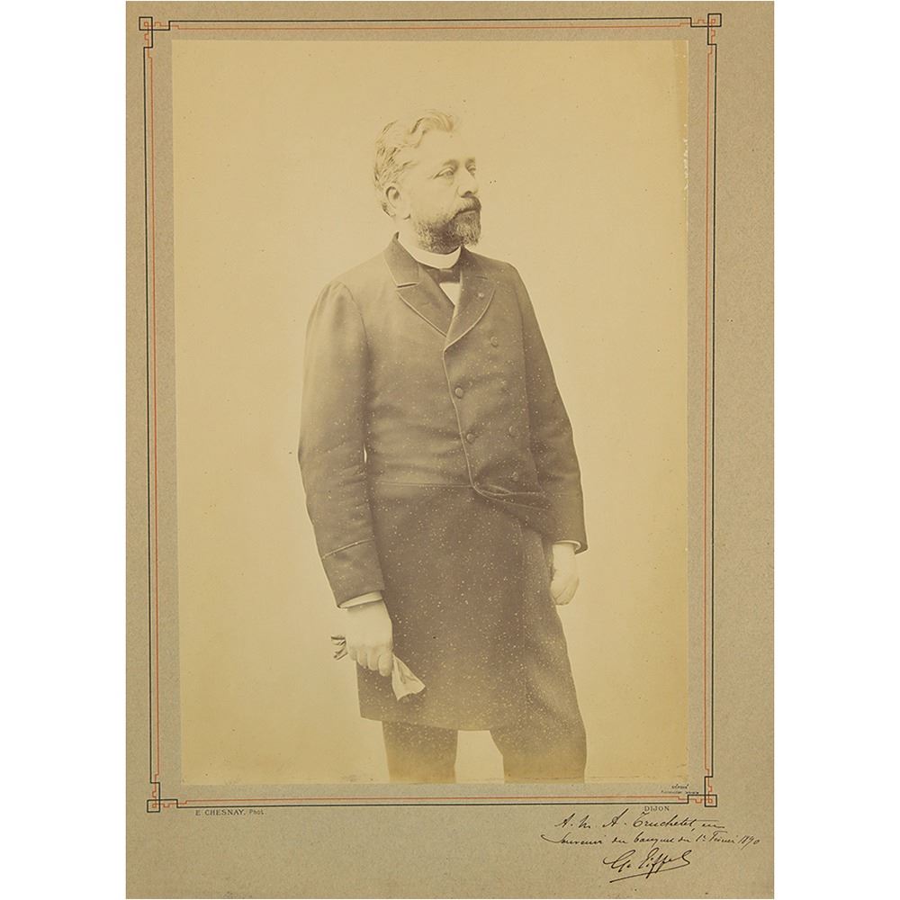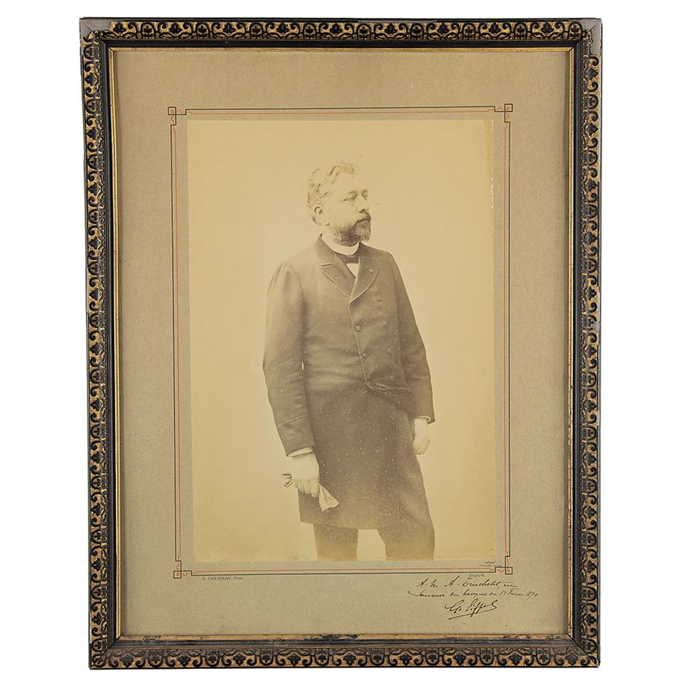 Amazing oversized 11 x 16 albumen portrait of Gustave Eiffel in a three-quarter-length pose by E. Chesnay of Dijon, affixed to its original 16.25 x 21 mount, neatly signed and inscribed on the mount in ink, "A M. A. Truchetet en souvenir du banquet du 1e Fevrier 1890, G. Eiffel.†Displayed in its original frame to an overall size of 18.5 x 23. In fine condition, with chipping to the frame's ornamental veneer (most noticeably to top corners). Around this time Eiffel would have been celebrating the one-year anniversary of the completion of his masterpiece, the Eiffel Tower in Paris, which opened on March 31, 1889. Signed photographs of Eiffel are scarce in any size, and virtually unheard of in this massive format.
