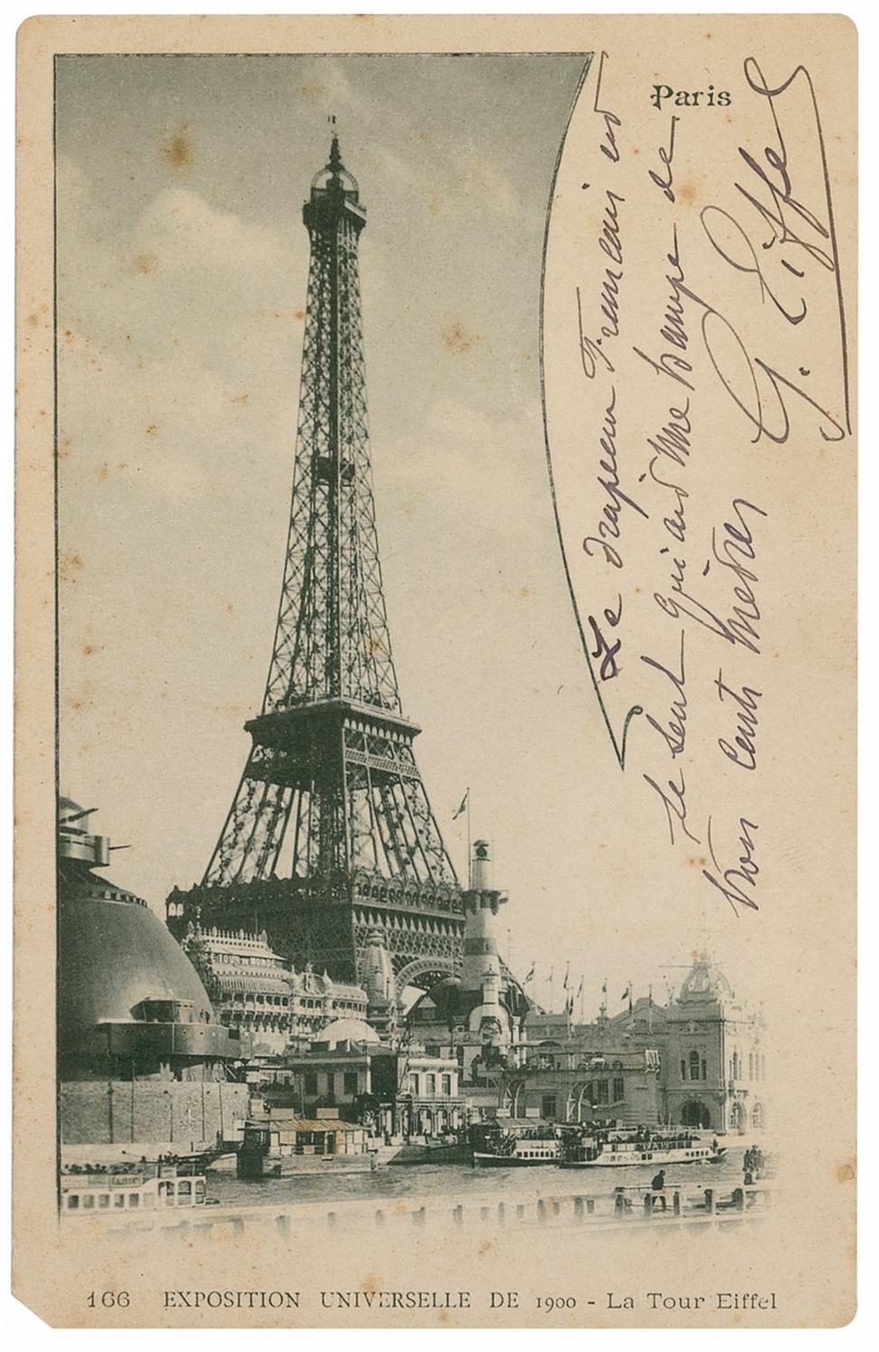Vintage 3.5 x 5.5 postcard photo of the Eiffel Tower, signed vertically in fountain pen “G. Eiffel,” beneath a notation in French in another hand. In very good condition, with scattered toning and spotting, light soiling, and a chipped lower left corner. A great association between the Eiffel Tower and its namesake.