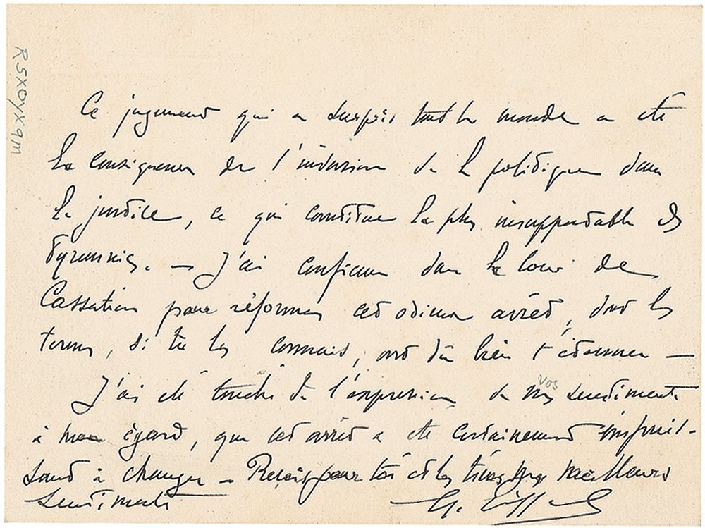 French engineer (1832–1923) best remembered for designing the tower that bears his name. ALS in French, signed “G. Eiffel,” one page both sides, 5.25 x 4, February 13, 1893. Letter to “my dear Paul.” In full (translated): “Since your letter, I have been badly hurt by the condemnation that has struck me, and which has aroused general disapproval from Paris. I have been sent many expressions of sympathy, which have touched me greatly, but among those the ones sent from my family are the most sensible to me. This judgment that has surprised everyone is in fact an invasion of justice by politics which the most unbearable of tyrannies. I have confidence in the court to reverse this heinous decree, of which, the terms, if you know them, have probably shocked you. I was touched by your expression toward me that this decree will surely change. Receive for you and your close ones.”