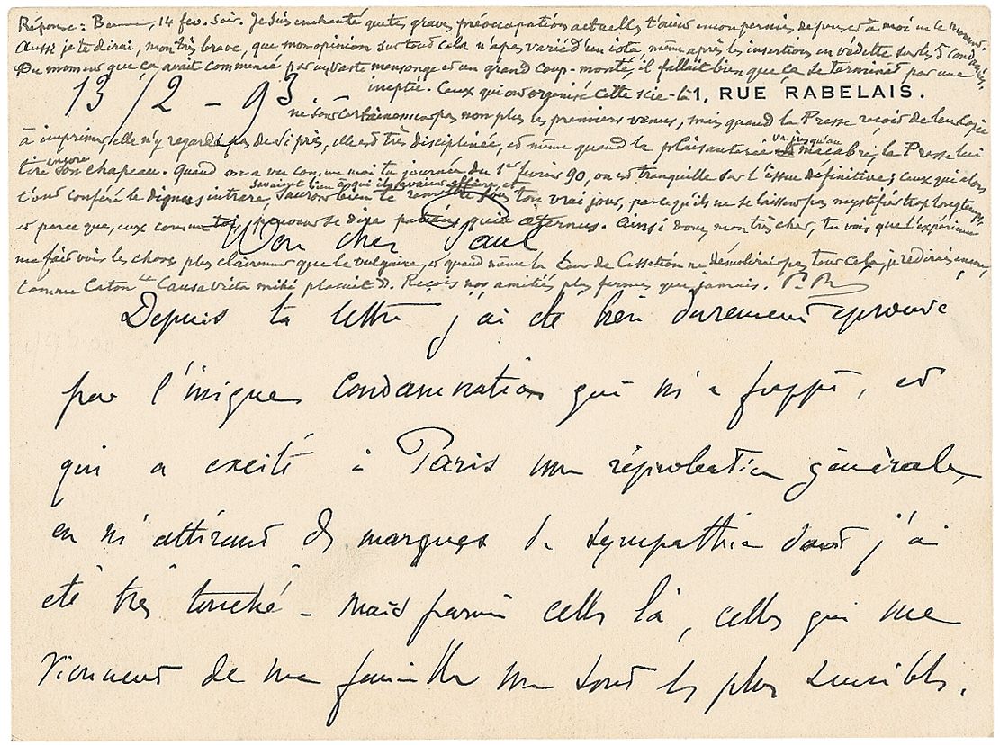 A handwritten response, presumably from the recipient, also in French, reads, “Response, Berne, I4 Febr., night. I am enchanted that your important present preoccupations still allowed you to think of me. At least in this moment I will also tell you, my brave [friend], that my opinion on all this had not varied one iota, even after the insertion of the Eve condemnations. From the moment it started, with a big lie and a big deception, it was obvious it will end in ineptitude. Those who organized this, are certainly no amateurs, but when the Press received the copies from them to print, it does not look at them too closely, it is very disciplined, and even when the joke becomes macabre, the Press still tips its hat. When one has seen as have the day of the first of January [18]90, one is at ease with the definitive issues; those who have conferred to you, knew them with whom they had to deal, knowing well to support you for your important day, because they will not let themselves be mystified for too long. Therefore, my dear [friend] you see that the experience makes me see things much more clearly than the vulgar, and that even the court would not demolish all this. I will say once more, like Cato, ‘cause viti mihi placuit.’ Receive my demonstrations of friendship which are stronger than ever.” In fine condition, with a small pencil notation to reverse and response approaching beginning of Eiffel’s text.