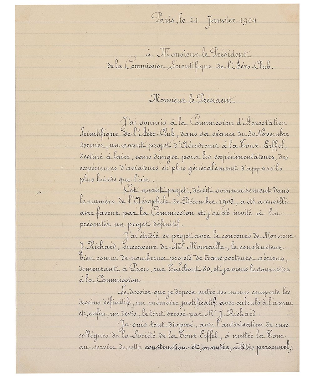 LS in French, signed “G. Eiffel,” two pages, lightly-lined on two adjoining sheets, 8 x 10.25, January 21, 1904, to the President of the Scientific Commission of the Aero-Club. In part (translated): “I have submitted a preliminary proposal for an airport at the Eiffel Tower to the Scientific Aerostation Commission of the Aéro Club…an airport intended to be without danger for aviators and aviation experiments and more generally for heavier than air devices. This preliminary draft, summarily described in the December 1903 issue of ‘The Aérophile’ was favorably received by the Commission and I was invited to present a definite project. I studied this project together with Mr. J. Richard, successor to Mr. Mouraille, the well-known constructor of numerous air transport projects…and I’ve just submitted it to the Commission. The dossier I’ve placed in their hands includes the definitive drawings, a supporting statement with supporting calculations, and finally, a cost-estimate, all drawn up by Mr. J. Richard.