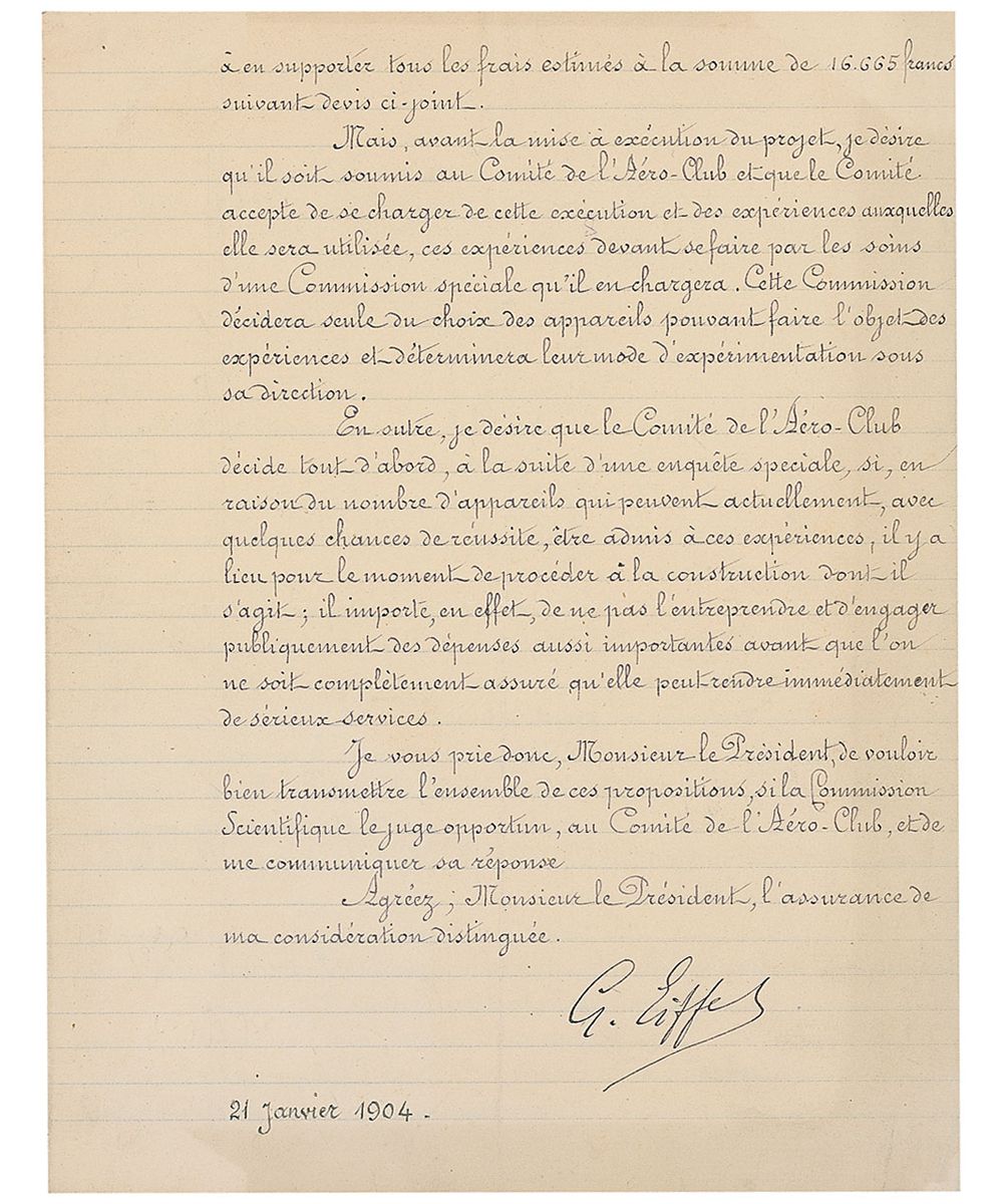 I am entirely prepared, with the authorization of my colleagues in the Eiffel Tower Society, to place the Tower at the service of this construction and furthermore, in my own personal capacity, to assume all the costs estimated at the sum of 16.665 francs according to the estimate herewith included. But before the implementation of the project, I ask that it be submitted to the Committee of the Aéro-Club…this Commission alone will decide on the type of aircraft that can be used in the experiments and will determine the manner in which the experiments are to be made…Furthermore I Wish the Committee of the Aero-Club…to make a special inquiry concerning the chances for success of the aircraft that will be used in these experiments…Before starting construction and committing such large sums of money it is important that one should be completely assured that the project will immediately provide significant services…I therefore ask you Mr. President to be so kind as to transmit…these propositions to the Committee of the Aero Club…Please communicate their answer to me.” In fine condition.