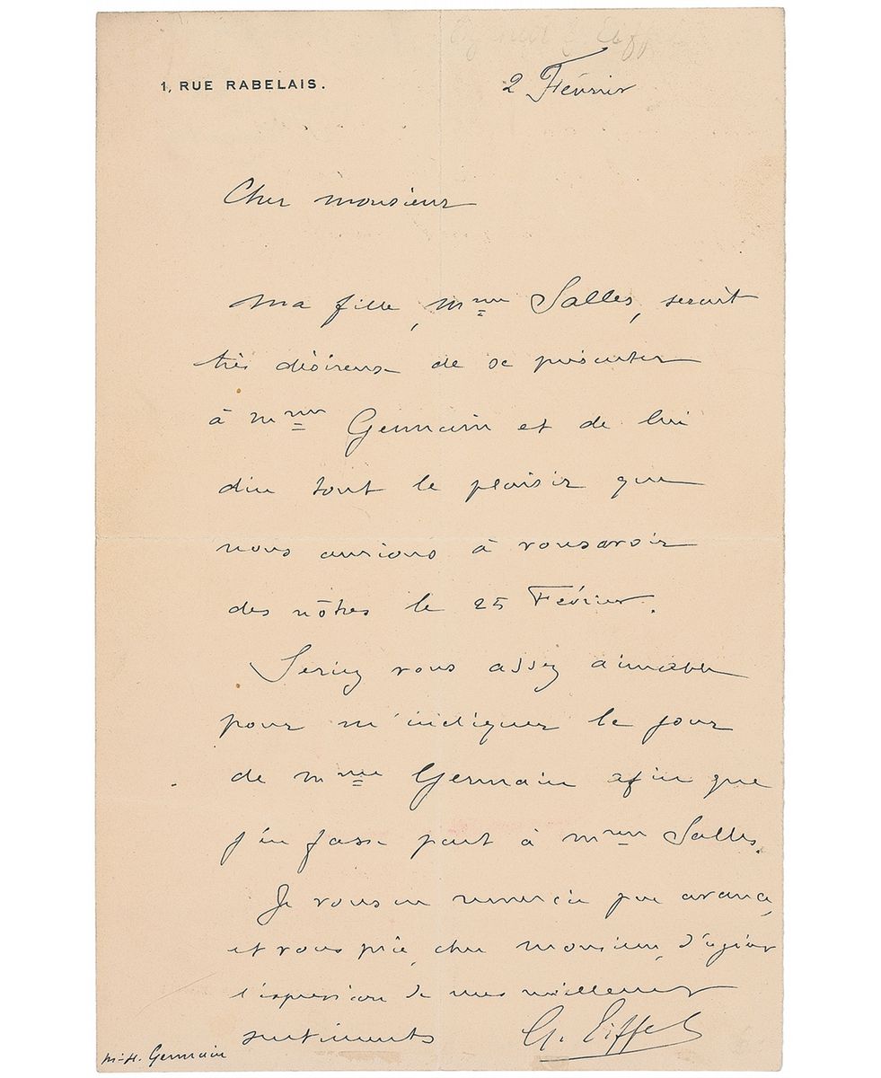 ALS in French, signed “G. Eiffel,” one page, 5.25 x 8, personal letterhead, February 2, no year. A letter written on the behalf of his daughter, Claire Eiffel Salles. In part (translated): “My daughter, Mrs. Salles, would be keen to attend to Mrs. Germain and tell her it would be a pleasure to have you join us on February 25. Would you be kind enough to tell me the day that Mrs. Germain responds so I may convey to Ms. Salles.” In fine condition, with central vertical and horizontal folds and trivial adhesive remnants to the bottom edge. Accompanied by a 1940s postcard photo of the Eiffel Tower.