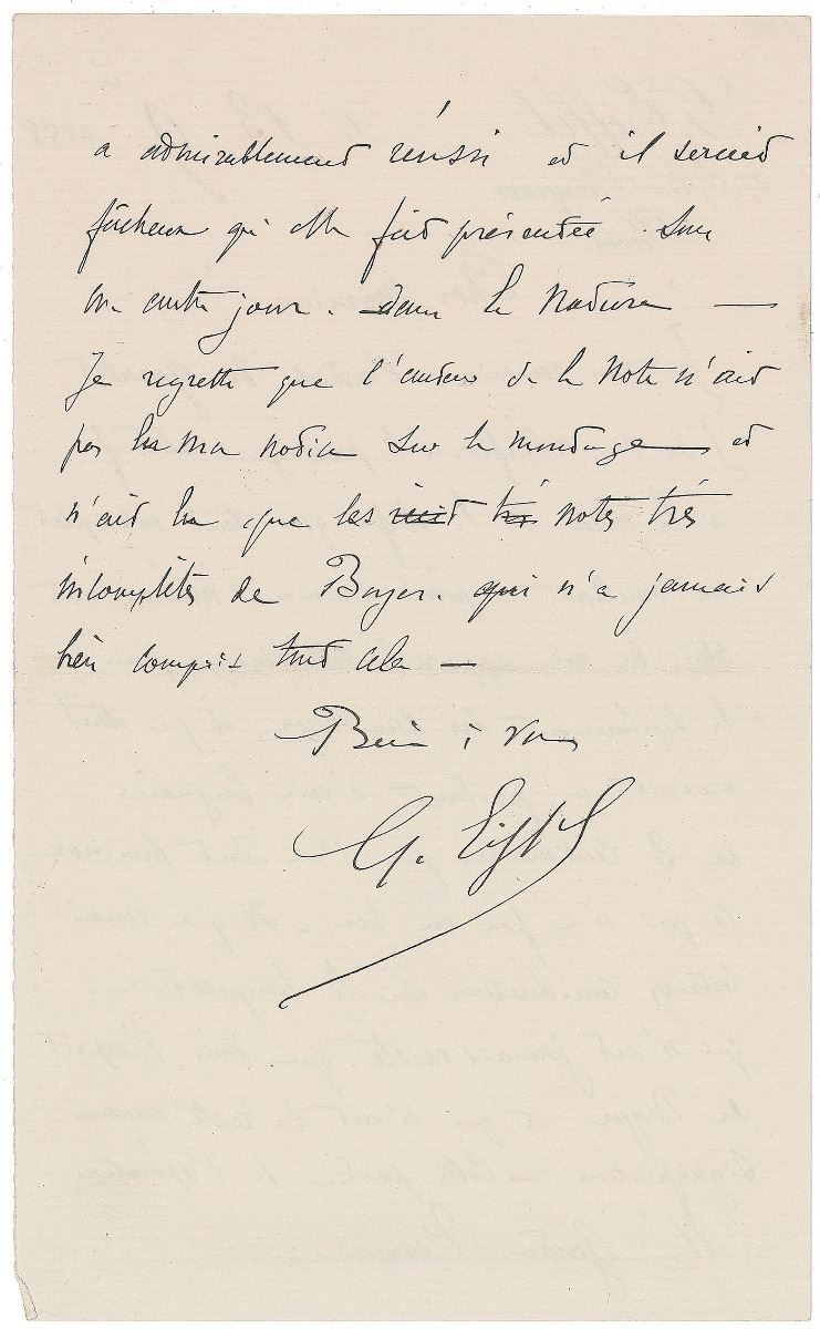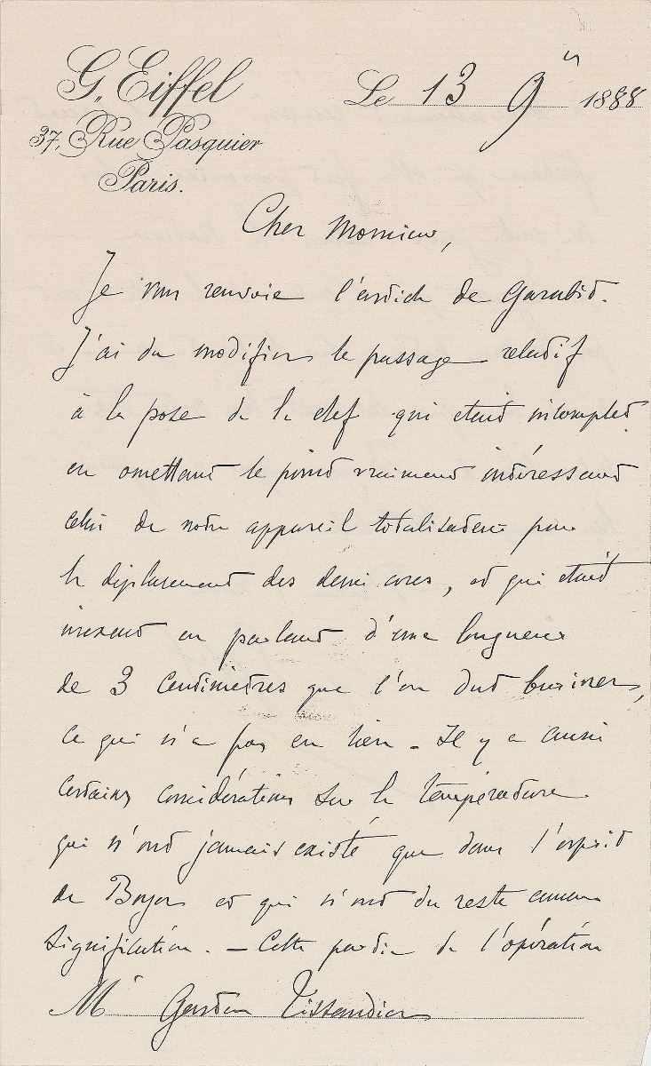 ALS in French, signed “G. Eiffel,” one page both sides, 5 x 8.5, personal letterhead, September 13, 1888. Letter to French aeronaut and scientist Gaston Tissandier. In part (translated): "I am sending you back the article about Garabit. I had to modify an incomplete part relating to placing the key, omitting the truly interesting point about our totalizer apparatus for shifting half arcs, and which was [illegible] when speaking about a 3 centimeters length that we had to chisel, which did not happen—there is also some temperature account that existed only in Boyer’s mind and moreover has no significance. This part of operation was admirably successful and it would be unfortunate that it be presented on another light—in the Nature—I regret that the author of the note did not get my assembly notice and only read Boyer’s very incomplete notes whom has never quite understood all this.” In fine condition.