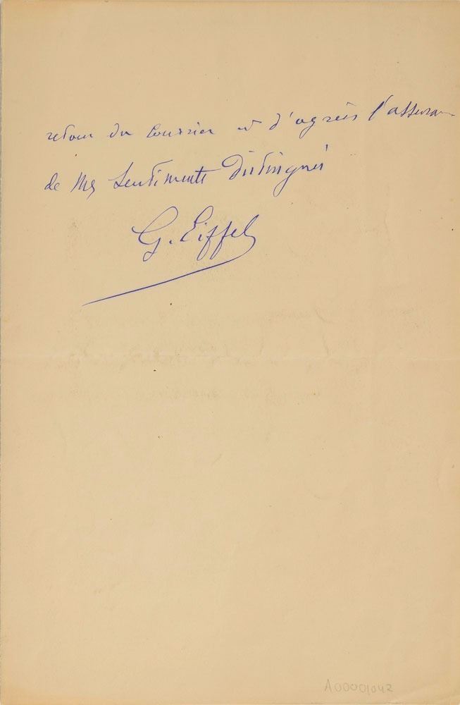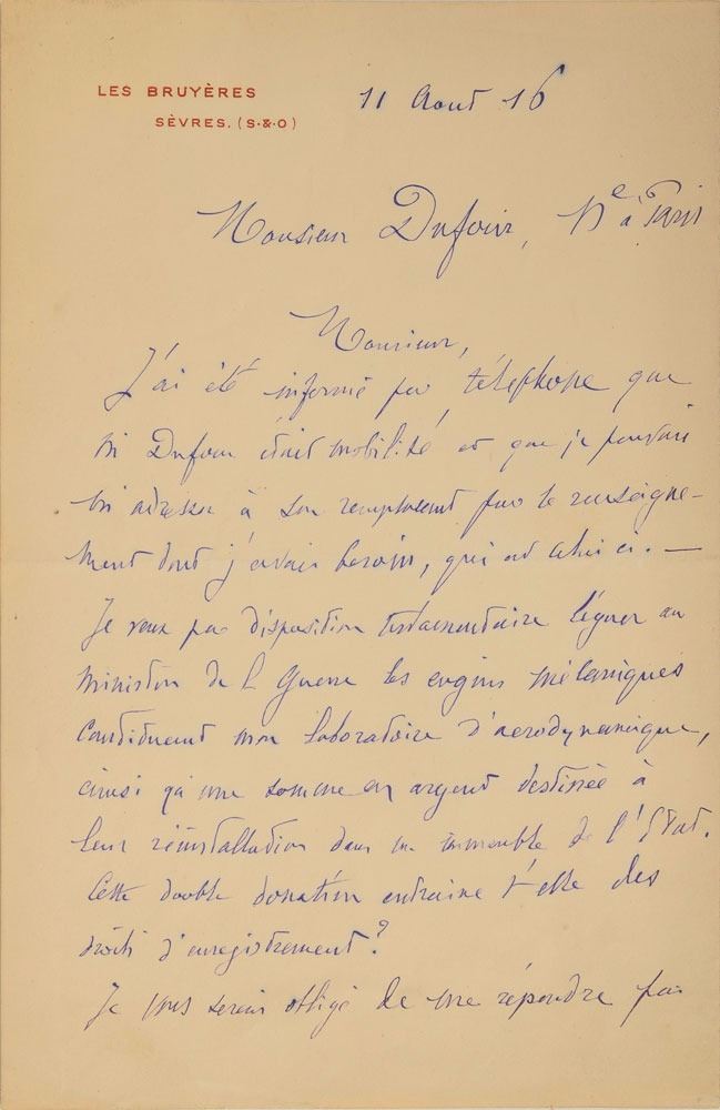 ALS in French, signed “G. Eiffel,” two pages on two adjoining sheets, 5.25 x 8.25, Les Bruyeres letterhead, August 11, 1916. Letter to Mr. Dufour, in part (translated): "I was informed by telephone that Mr. Dufour was drafted and that I should talk to his replacement about the information that I need, which is as follows: I wish to legally donate to the Ministry of War the mechanical devices currently in my aerodynamics laboratory, as well as a sum of money to be used for their transfer to, and installation in some State-owned building. Would this double donation necessitate some filing charges?" In fine condition, with splitting along the hinge. Though best known for his eponymous tower, Eiffel made significant contributions to the scientific study of aerodynamics. Early on, he conducted 'drop tests' of various objects from the Eiffel tower's 377-foot high second platform, and in 1909 expanded his research by building a wind tunnel at its base, where he used fans driven by electric motors to study air resistance in connection with aviation. Known as the 'Eiffel-type' wind tunnel, the designs he developed are still in use today.