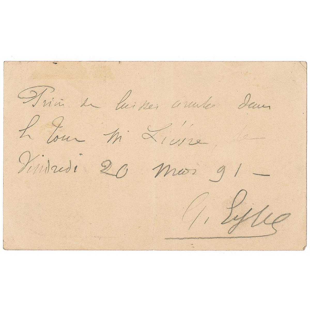 French engineer best remembered for designing the tower that bears his name. ANS in French, signed “G. Eiffel,” one page, 6.25 x 4, March 20, 1891. A handwritten pass to the Eiffel Tower written by Eiffel. In full (translated): “Please let him walk at the tower, Mr. Lievre.” In very good condition, with central vertical fold, some scattered light soiling and creasing, and mounting remnants to reverse.