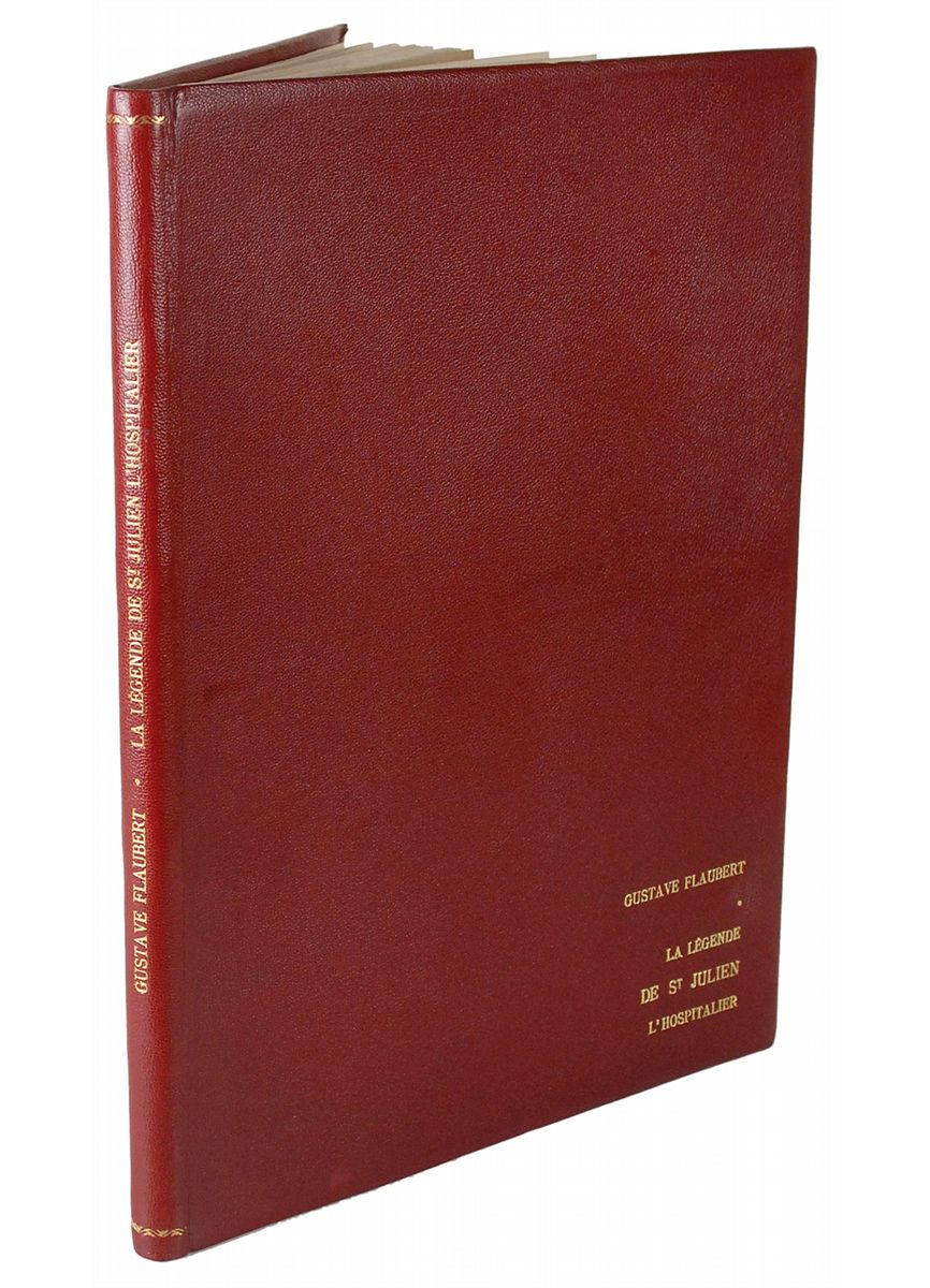 Celebrated French novelist (1821–1880) best known for his classics Madame Bovary, Salammbô, and A Sentimental Education. Rare ALS in French, signed “Gv Flaubert,” one page, 5.25 x 8.25, March 1875. Letter to Ivan Turgenev. In full (translated): “I think tomorrow I'll be at Courmanche. Come and take me at 9 a.m. to go to Hugo's father. Answer me so that I know if I have to wait. I do not! It's not worth it, I expect you until 9 ½.” Affixed to the free end page of a gorgeously leatherbound limited edition of Flaubert’s La Légende de Saint-Julien l'Hospitalier, numbered 130/200, published by Ecole Estienne, 1937. In fine condition, with foxing to pages of the book.