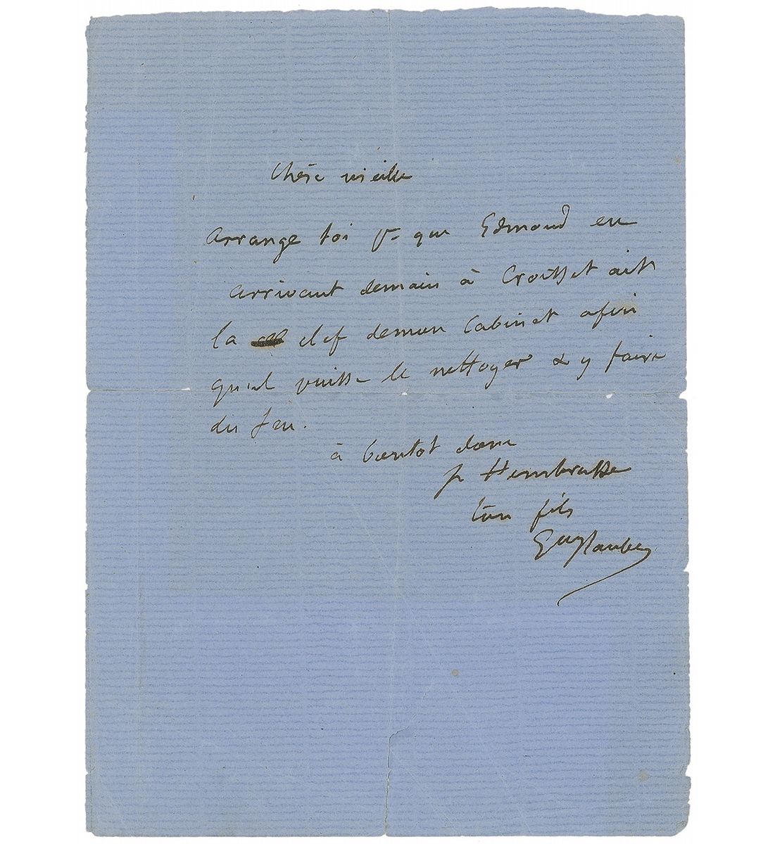 Celebrated French novelist (1821–1880) best known for his classics Madame Bovary, Salammbô, and A Sentimental Education. Boldly penned ALS in French, signed “Gv. Flaubert,” one page, 5.25 x 7.5, no date. Letter to his mother. In part (translated): “Arrange for Edmond arriving tomorrow at Croisset. He has the key to my office so he could clean it & make fire. See you soon.” Intersecting folds with a cleanly repaired separation to the central horizontal fold, scattered creases, and a few small edge chips and tears, otherwise fine condition. Flaubert lived in Croisset for nearly 40 years in a house overlooking the Seine and completed much of his work there.