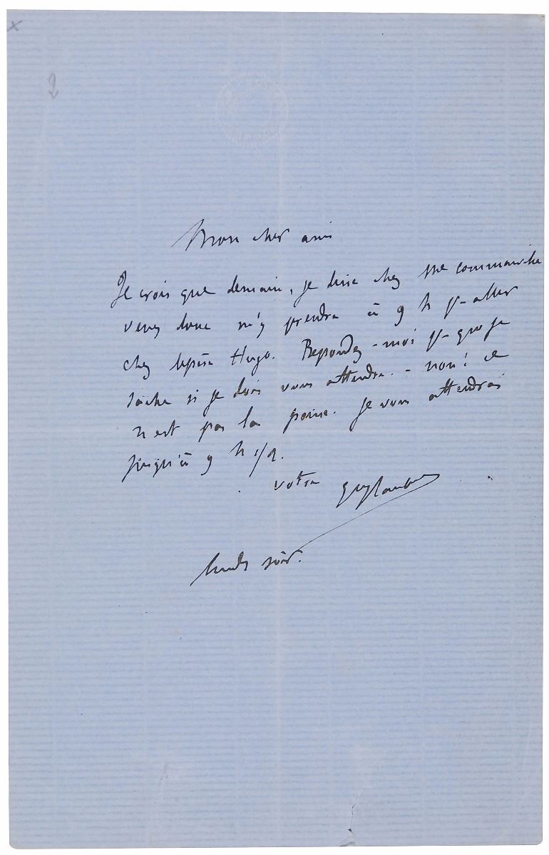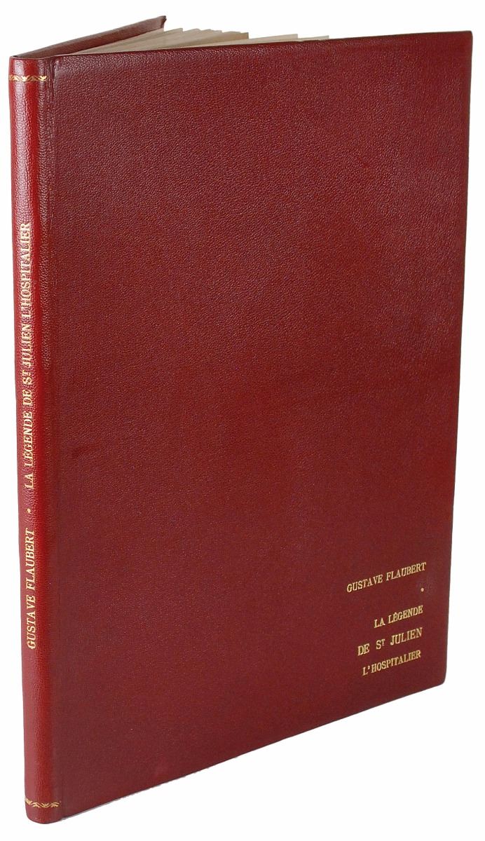 Celebrated French novelist (1821–1880) best known for his classics Madame Bovary, Salammbo, and A Sentimental Education. Rare ALS in French, signed “Gv Flaubert,” one page, 5.25 x 8.25, March 1875. Letter to Ivan Turgenev. In full (translated): “I think tomorrow I'll be at Courmanche. Come and take me at 9 a.m. to go to Hugo's father. Answer me so that I know if I have to wait. I do not! It's not worth it, I expect you until 9 ½.” Affixed to the free end page of a gorgeously leatherbound limited edition of Flaubert’s La Legende de Saint-Julien l'Hospitalier, numbered 130/200, published by Ecole Estienne, 1937. In fine condition, with foxing to pages of the book.