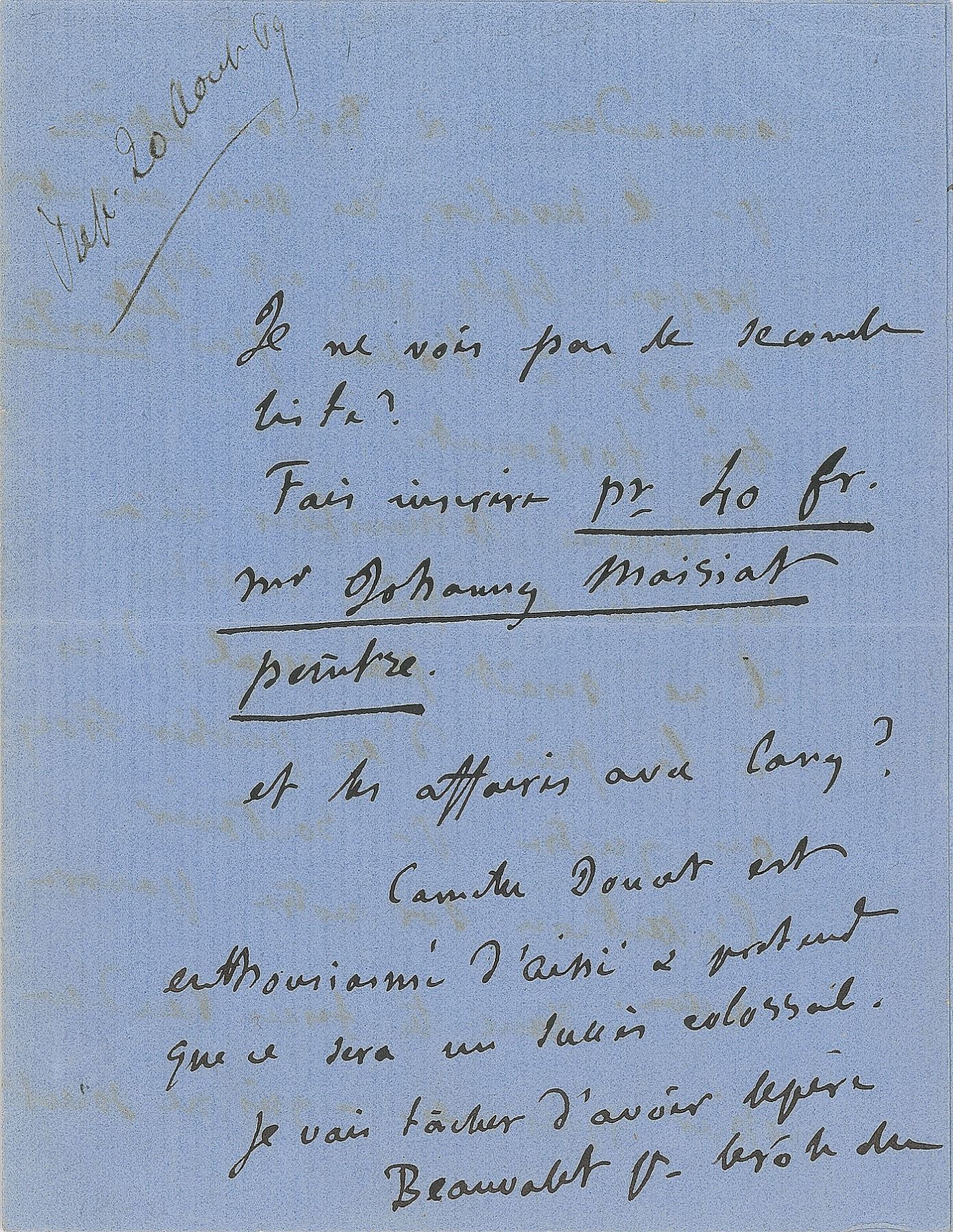 Celebrated French novelist (1821–1880) best known for his classics Madame Bovary, Salammbo, and A Sentimental Education. ALS in French, signed “Gu. Flaubert,” three pages on two adjoining sheets, 4 x 5.25, August 1869. After the death of his childhood friend, Louis Bouilhet, Flaubert writes to Bouilhet's adopted son, Philippe Leparfait, concerning his efforts to stage Bouilhet's historical verse drama, Mademoiselle Aïssé. In part (translated): "Camille Doucet is enthusiastic about Aïssé & claims that it will be a colossal success. I will try to have Father Beauvalet for the role of the Commander—& Berton the father for the knight." He also discusses the potential publication of unpublished pieces. In fine condition, with light offsetting to the ink on the first page. Accompanied by an export certificate from the French Ministry of Culture. After many difficulties and without much success, on January 6, 1872, Flaubert succeeded in staging Mademoiselle Aïssé at the Odeon. A highly desirable letter connecting Flaubert's personal friendship with the literary world.