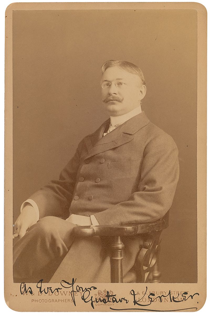 German composer and conductor who became a Broadway musical director (1857–1923). Original 4.25 x 6.5 cabinet portrait of Kerker seated, signed in the lower border in black ink, “As ever yours, Gustave Kerker,” and signed and inscribed on the reverse, “To the friend of any youth, Richard Copley, from Gustave Kerker.” Published by W. & D. Downey of London. In fine condition, with light contrast to signature on the reverse against the studio text.