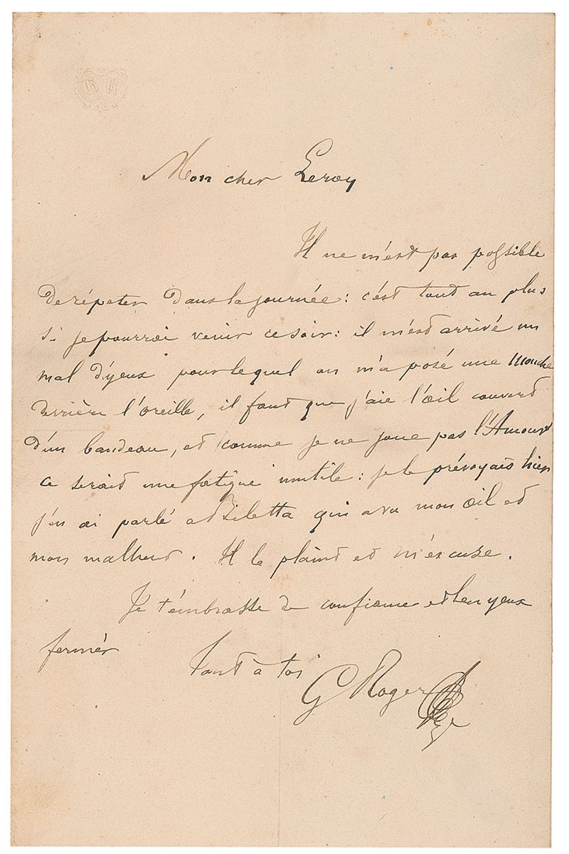 Distinguished French tenor (1815–1879). Untranslated ALS in French, signed “G. Roger,” one page, 5.25 x 8, no date. Affixed to a same-size sheet. In fine condition, with central vertical and horizontal folds.