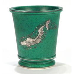 Gustavsberg Argenta ware vase with silver metal inlay depicting a fish on a turquoise ground, painted marks to base, 16cm high