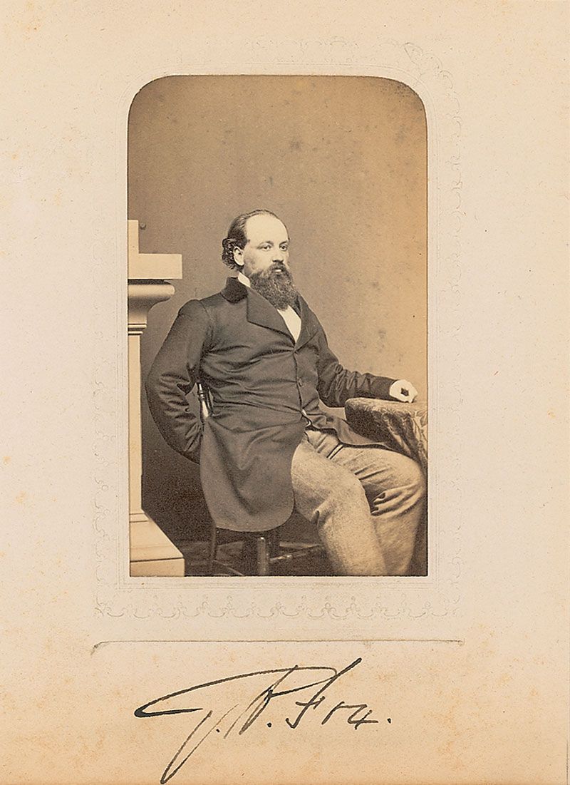 Assistant secretary of the Navy during the Civil War (1821–1883). Original 2.25 x 4 carte-de-visite portrait of Fox presented in an original 3.75 x 5.25 mat, signed on the mat in black ink, “G. V. Fox.” Light toning to the lower border (slightly affecting the signature), otherwise fine condition.