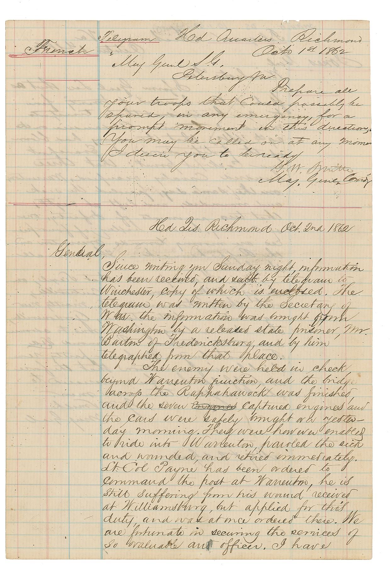 Confederate general from Kentucky (1821–1896) who took command of the Army of Northern Virginia for one day in 1862 before being replaced by Robert E. Lee. Civil War–dated manuscript copies of five telegrams, signed four times, “G. W. Smith,” three pages both sides, 7.25 x 10.75, October 1–4, 1862. A message of October 1st, which is secretarially signed, is to "Jones Gen'l," in part: "Inform Gen'l Lee that a fleet of One hundred & twenty five transports moved up towards Alexandria on the 29th Ulto; that the enemy had blown up to fortifications at Evansport…It is reported that Siegel…moved on Centerville, with thirty thousand men, mostly new regiments." Another message of October 1st, signed by Smith, sent to a general in Petersburg, reads: "Prepare all your troops that could possibly be spared, in any emergency, for a prompt movement in this direction. You may be called on at any moment. I desire you to be ready."