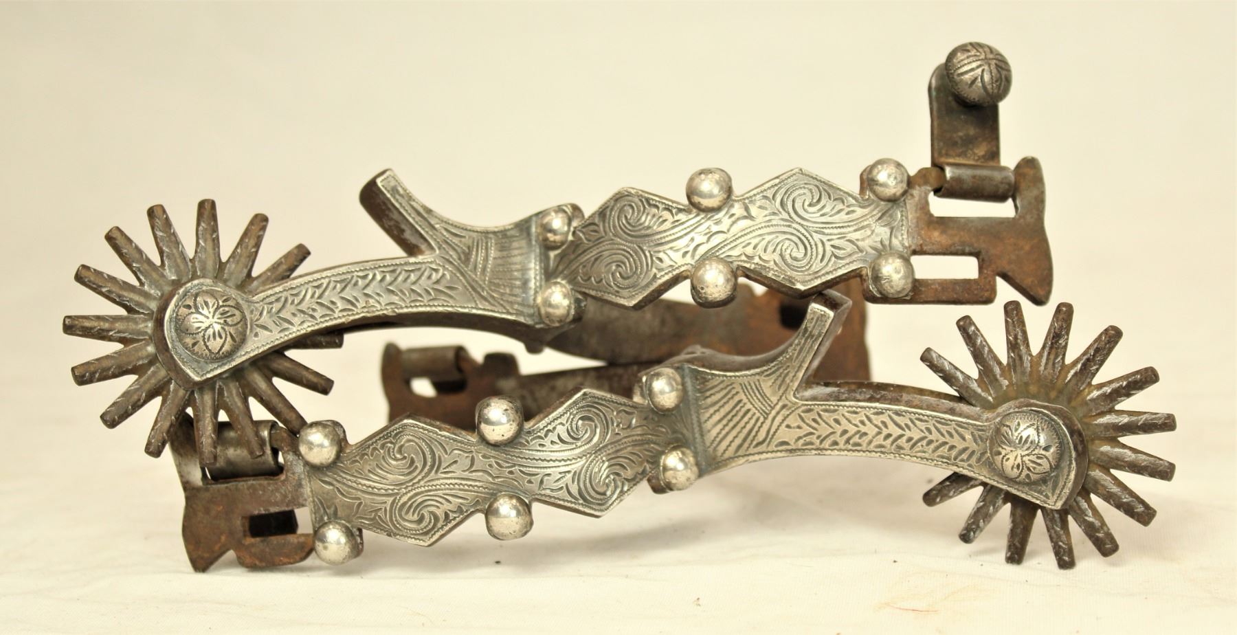 Very unique pair of single mounted spurs with full silver overlay, scalloped heelbands, multiple domes and deep stylish engraving, with swinging buttons and wonderful lagre rowels with feathered tips.
