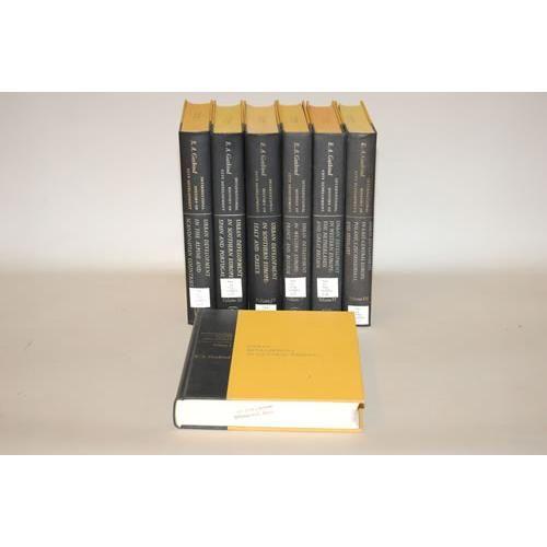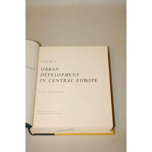 Gutkind, E.A.. International History of City Development - 7 (of 8) Volumes. New York: The Free Press of Glencoe / Macmillan Co., 4to - over 9¾" - 12" tall. Hard Cover. Ex-Library. Very Good Condition. 1964-1972. 1) Urban Development in Central Europe. 2) Urban Development in the Alpine and Scandinavian Countries. 3) Urban Development in Southern Europe: Spain and Portugal. 4) Urban Development in Southern Europe: Italy and Greece. 5) Urban Development in Western Europe: France and Belgium. 6) Urban Development in Western Europe: The Netherlands and Great Britain. 7) Urban Development in East-Central Europe: Poland, Czechoslovakia, and Hungary. Lacks volume 8. In original cloth binding, with binding & hinges tight. ILLUSTRATED THROUGHOUT THE SERIES.