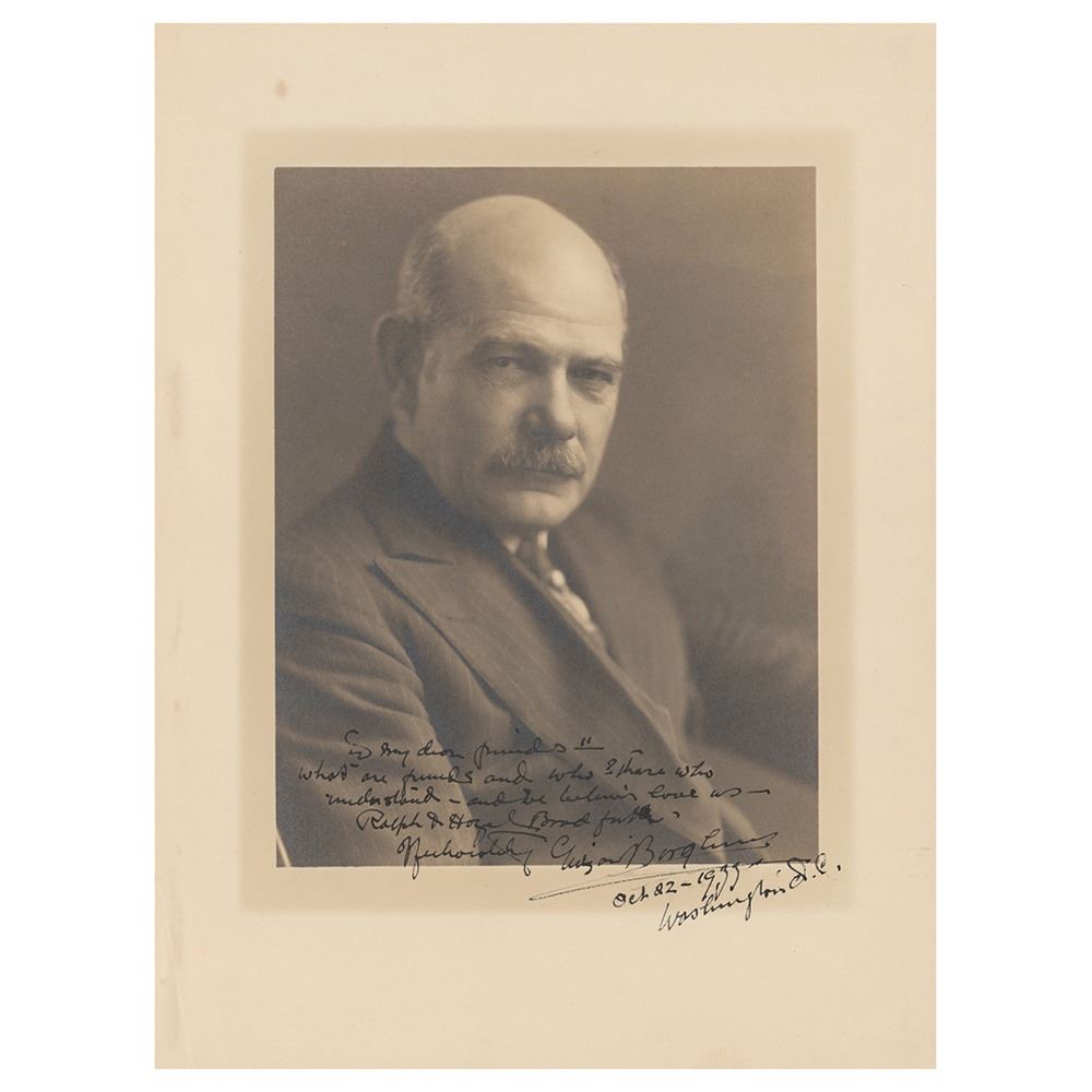 Matte-finish 10 x 13.5 photo, signed and inscribed in fountain pen, "To my dear friends—What are friends and who? Those who understand—and we believe love us—Ralph & Hazel Bradford, affectionately, Gutzon Borglum, Oct 22-1933, Washington D.C." In fine condition, with a few light border stains, and a crease to the lower left corner. Ralph Bradford, a writer and manager of the Corpus Christi Chamber of Congress, was a close friend of Borglum and employed him while planning the redevelopment of the Corpus Christi waterfront in the late 1920s. He produced several models of his sweeping redesign of the bayfront, which called for a smooth seawall resembling an amphitheater topped by parapets, a grand boulevard dotted with parks, and an imposing 32-foot statue of Christ atop the rock jetties in the bay. The plan was eventually tabled, though postwar construction somewhat resembled his plans. A fascinating association with one of Borglum's unrealized artistic visions.