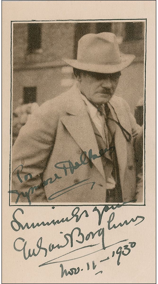Distinguished American sculptor (1867–1941) best known for his monumental depiction of four presidents on Mount Rushmore. Vintage 2.25 x 3.5 magazine photo of Borglum outdoors, affixed to a 2.75 x 5.5 off-white slip, signed and inscribed in fountain pen “To Seymore Thalpen, Sincerely yours, Gutzon Borglum, Nov. 11—1930.” In fine condition.