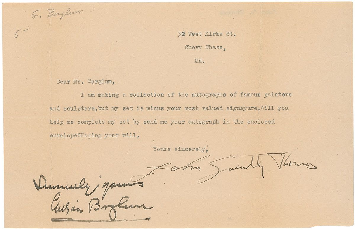 Distinguished American sculptor (1867–1941) best known for his monumental depiction of four presidents on Mount Rushmore. Fountain pen signature, “Sincerely yours, Gutzon Borglum,” at the bottom of an off-white 8.5 x 5.25 sheet bearing a TLS to Borglum requesting his autograph. A vertical fold through a single letter of sentiment, a rough bottom edge, uniform toning, and a small pencil notation at top, otherwise fine condition.