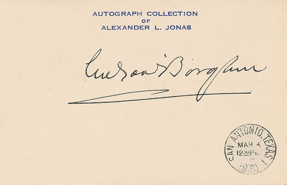 Vintage fountain pen signature, “Gutzon Borglum,” on an off-white 4.5 x 3 custom-made collector’s card with a clipped March 4, 1930, San Antonio, Texas, postmark affixed to lower right corner. In fine condition, with mounting remnants to reverse from prev