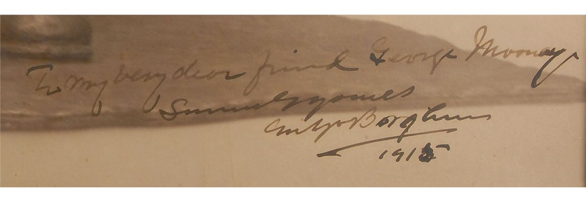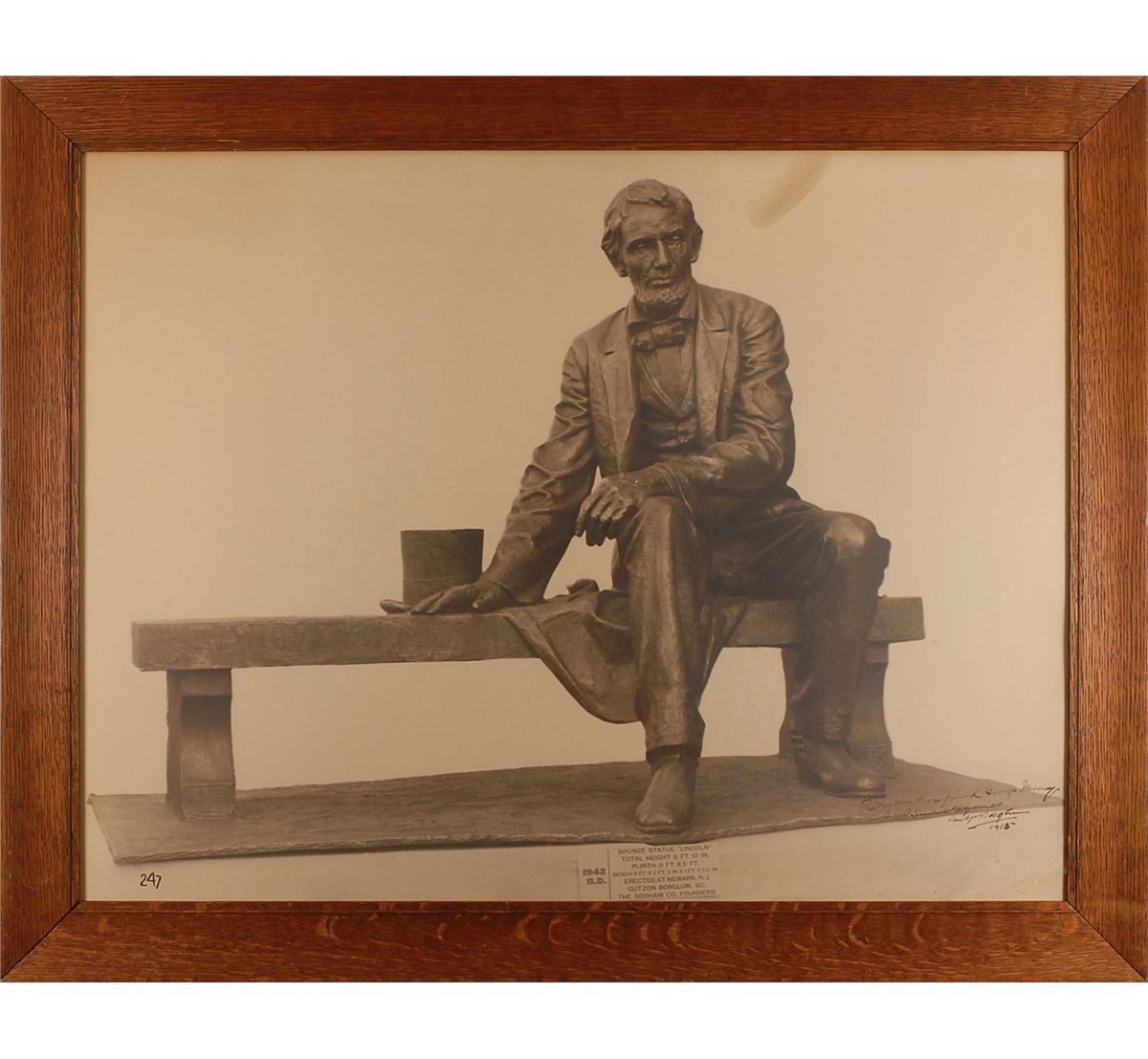 Vintage print, 35.5 x 27, of Borglum’s work entitled ‘Seated Lincoln,’ signed and inscribed in black ink, “To my very dear friend George Mooney, Sincerely yours, Gutzon Borglum, 1915.” Framed to an overall size of 41.5 x 33. A bit of light spotting along bottom and to forehead area of image, a small area of dampstaining and paper loss to lower right corner, and a light area of soiling to background, otherwise fine condition. ‘Seated Lincoln’ is located next to the Essex County Courthouse in Newark, New Jersey. The sculpture was dedicated by President Theodore Roosevelt on Memorial Day in 1911. Oversized.