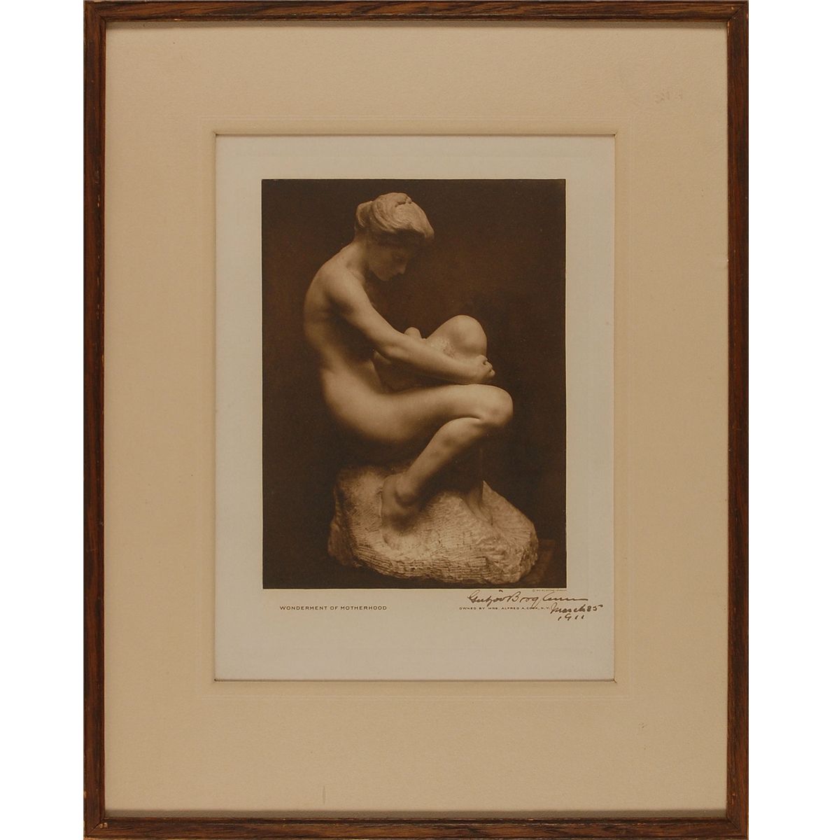 Vintage print, 8.25 x 11.5, of Borglum’s work entitled ‘Wonderment of Motherhood,’ signed under the image in black ink, “Gutzon Borglum, March 5, 1911.” Matted and framed to an overall size of 14 x 17.75. In fine condition.