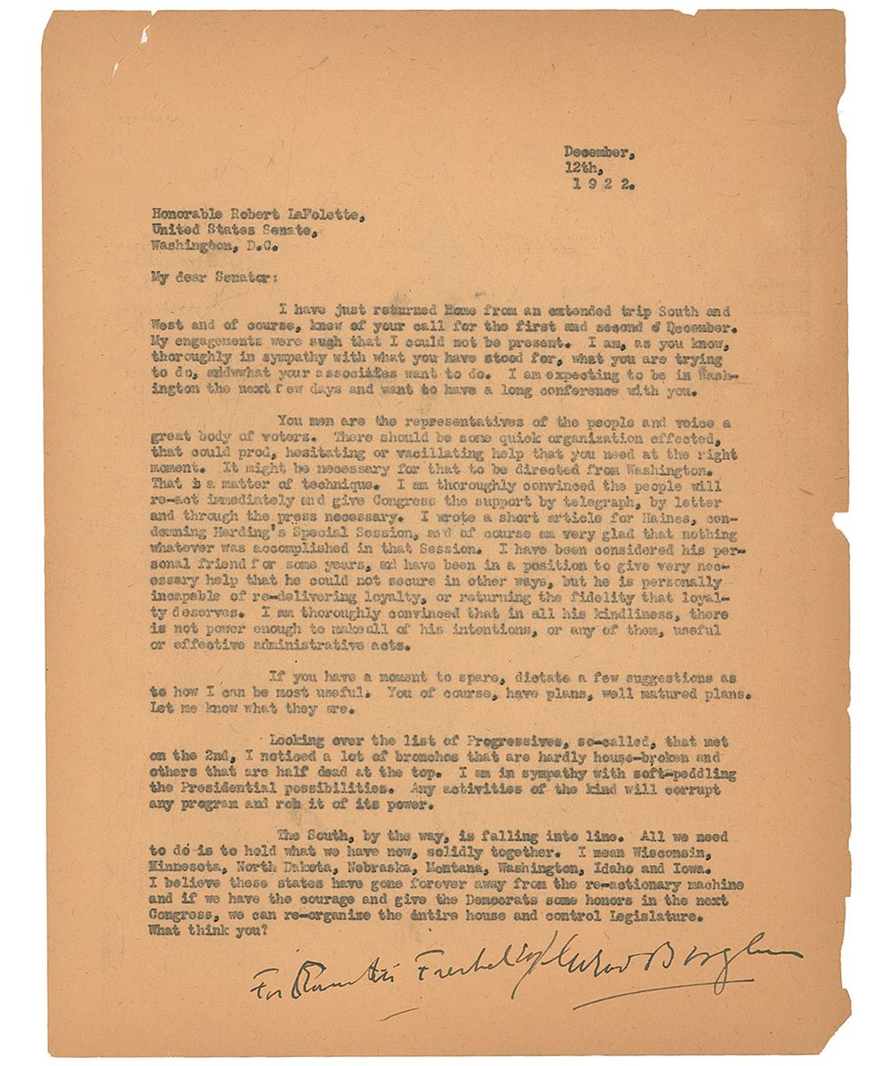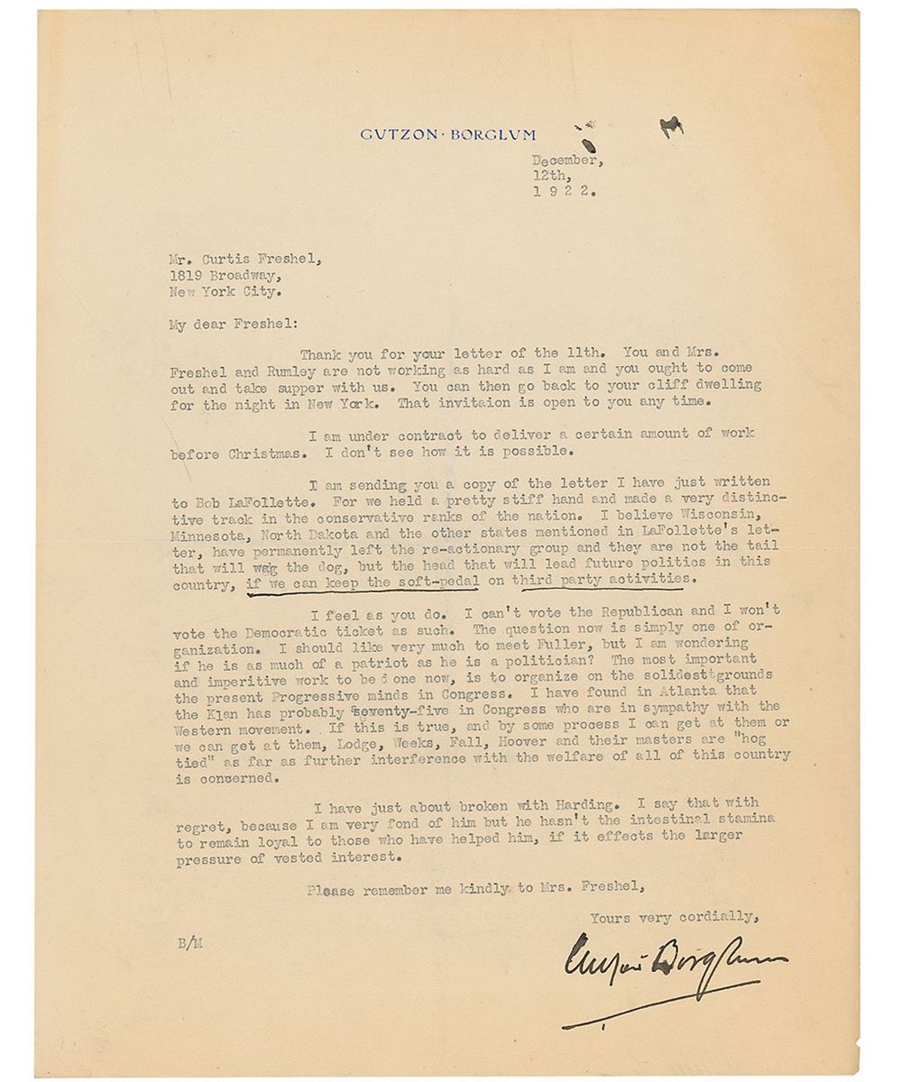Two TLSs, both 8.5 x 11 and dated December 12, 1922: one on personal letterhead to industrialist Curtis Freshel, in part: “I am under contract to deliver a certain amount of work before Christmas. I don’t see how it is possible. I am sending a copy of the letter I have just written to Bob LaFollette. For we held a very stiff hand and made a very distinctive track in the conservative ranks of the nation. I believe Wisconsin, Minnesota, North Dakota and the other states mentioned in LaFollette’s letter, have permanently left the re-actionary group and they are not the tail that will wag the dog, but the head that will lead future politics in this country, if we can keep the soft-pedal on third party activities. I feel as you do. I can’t vote Republican and I won’t vote the Democratic ticket as such. The question is simply one of organization. I should very much like to meet Fuller, but I am wondering if he is as much of a patriot as he is a politician? The most important and imperitive [sic] work to be done now, is to organize on the solidest grounds the present Progressive minds in Congress. I have found in Atlanta the Klan has probably seventy-five in Congress who are in sympathy with the Western movement. If this is true, and by some process I can get at them or we can get at them, Lodge, Weeks, Fall, Hoover and their masters are ‘hog tied’ as far as further interference with the welfare of all this country is concerned. I have just about broken with Harding. I say that with regret, because I am very fond of him but he hasn’t the intestinal stamina to remain loyal to those who have helped him, if it effects the larger pressure of vested interest;” and a signed carbon copy of the letter to LaFollette referenced, in part: “Looking over the list of Progressives, so-called, that met on the 2nd, I noticed a lot of bronchos [sic] that are hardly house-broken and others that are half dead at the top. I am in sympathy with soft-peddling the Presidential possibilities. Any activities of the kind will corrupt any program and rob it of its power. The South, by the way, is falling into line. All we need to do is hold what we have now, solidly together. I mean Wisconsin, Minnesota, North Dakota, Nebraska, Montana, Washington, Idaho, and Iowa. I believe these states have gone forever from the re-actionary machine and if we have the courage to give the Democrats some honors in the next Congress, we can re-organize the entire house and control Legislature.” Intersecting folds, overall toning, a few stray ink marks, and chipping to the right edge and staple holes to the letter to LaFollette, otherwise fine condition.