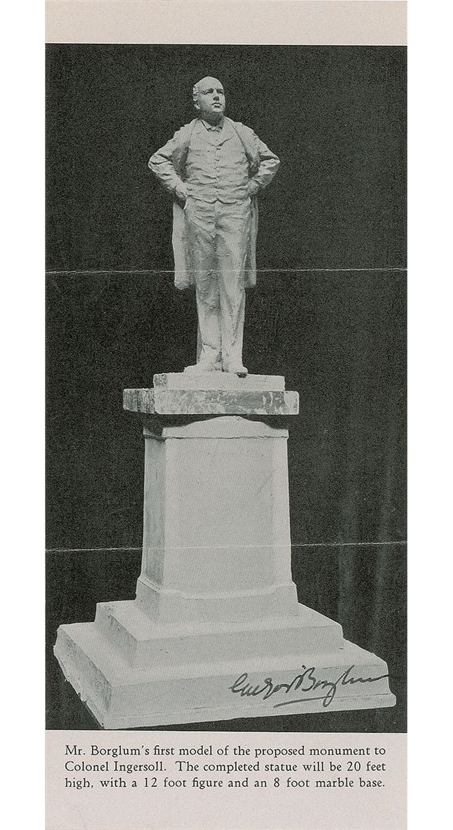 Vintage 4 x 9 magazine photo of Borglum’s first model for a proposed monument of R. G. Ingersoll, signed at the bottom of the image in fountain pen. Two horizontal folds, otherwise fine condition.