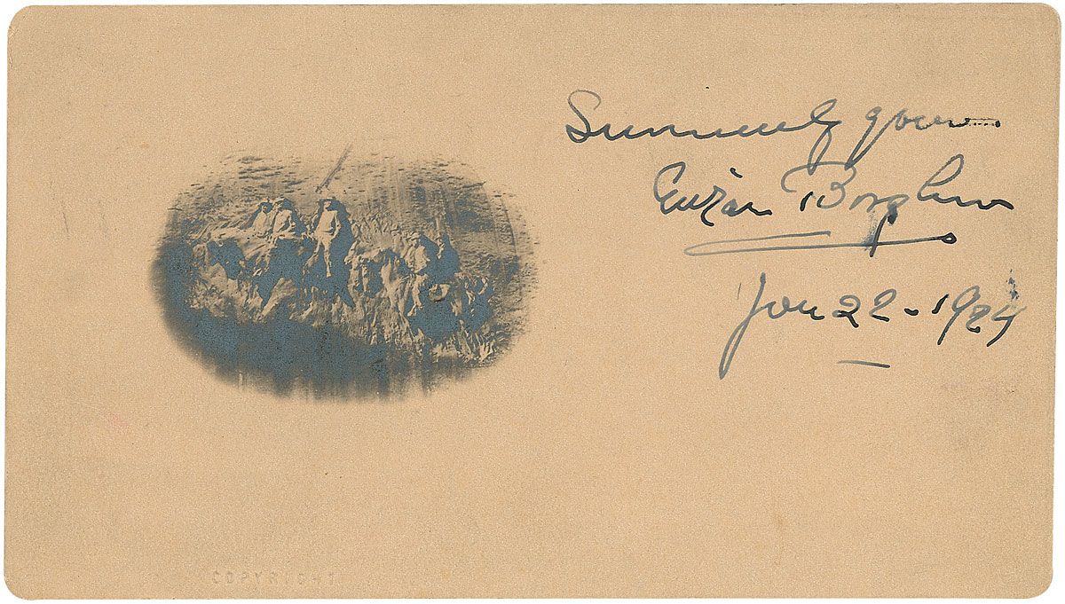 Vintage 6.5 x 3.75 photo of Borglum’s memorial to the heroes of the Confederacy planned for Stone Mountain, Georgia, signed in the large border in fountain pen, “Sincerely yours, Gutzon Borglum, Jan 22—1924.” In fine condition, with some silvering to image, a light brush to last name of signature, and a bit of scattered light soiling.