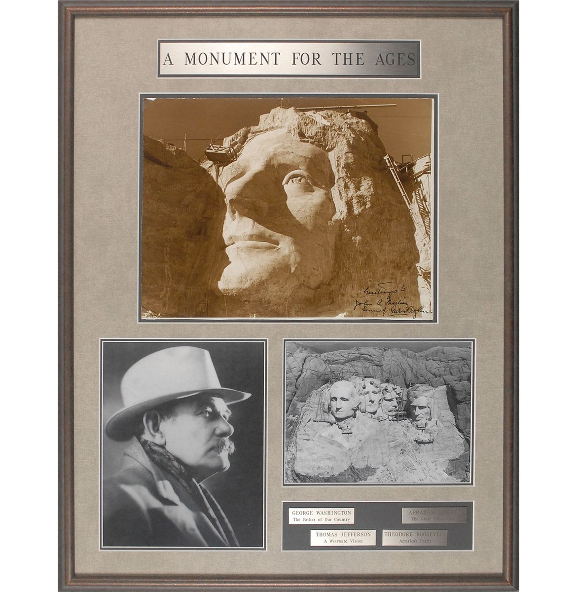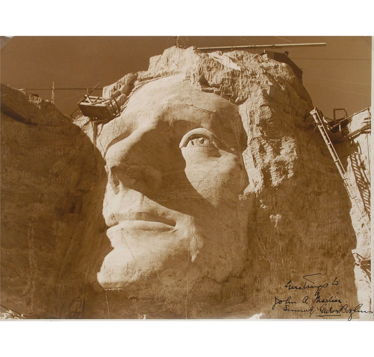Vintage matte-finish 13.25 x 10 close-up photo of the partially completed bust of Thomas Jefferson surrounded in ropes and scaffolding, signed and inscribed in black ink, “Greetings to John A. Martin, Sincerely Gutzon Borglum.” Double-matted and framed with a photo of Borglum, another image of Rushmore nearing completion, and several name plates, to an overall size of 21.5 x 27.5. In fine condition, with slightly trimmed edges and a small circular impression to lower left corner. Jefferson’s image was originally supposed to appear to the right of Washington, but unsuitable rock forced the artist to revise his masterpiece. A stunning and exceptionally rare photo, capturing the process of memorializing America’s second president. Oversized.