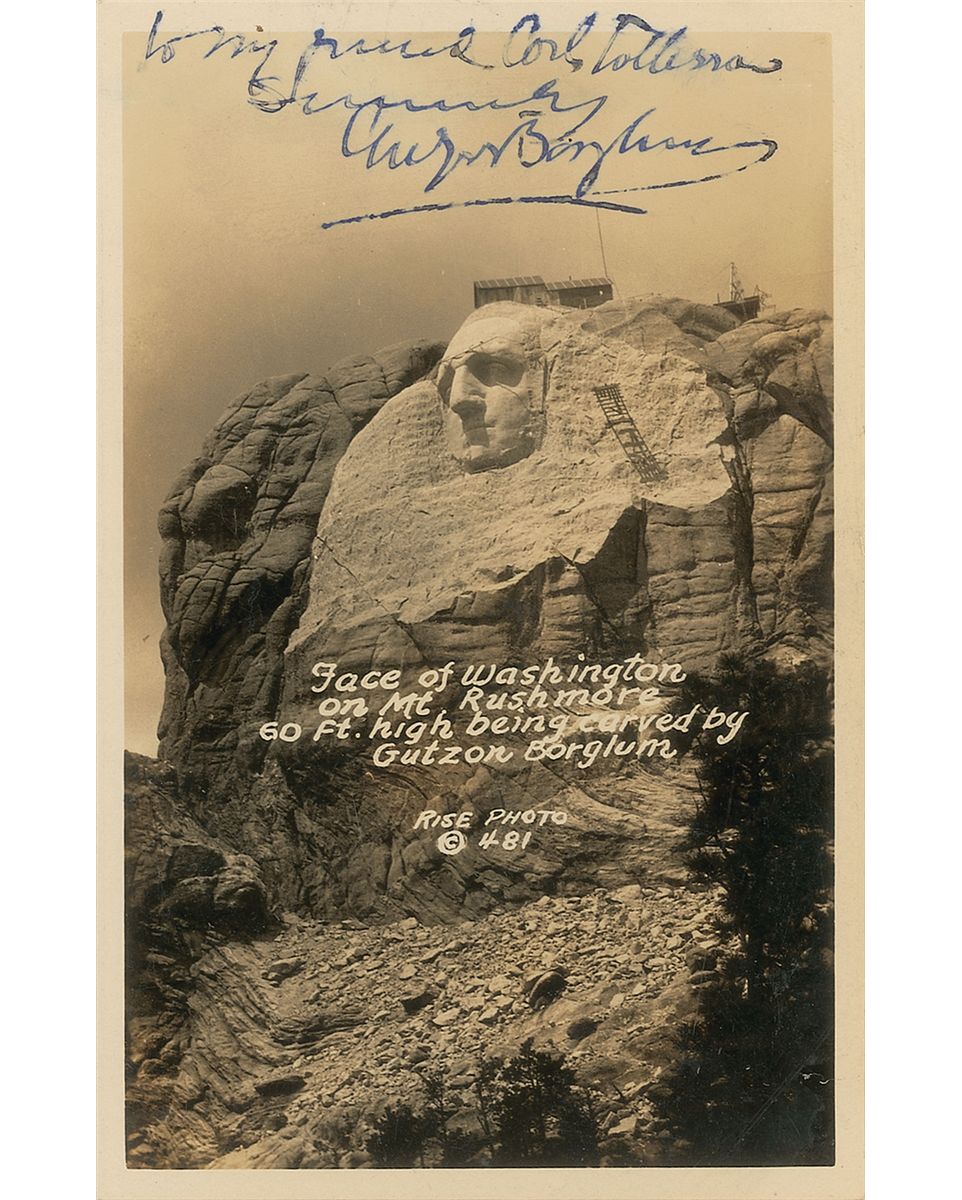 Fantastic glossy 3.5 x 5.5 postcard photo of Washington’s face during the early stages of carving Mount Rushmore, signed and inscribed at the top in fountain pen. In fine condition, with some skipping and brushing to ink. An uncommon and immensely desirable image.