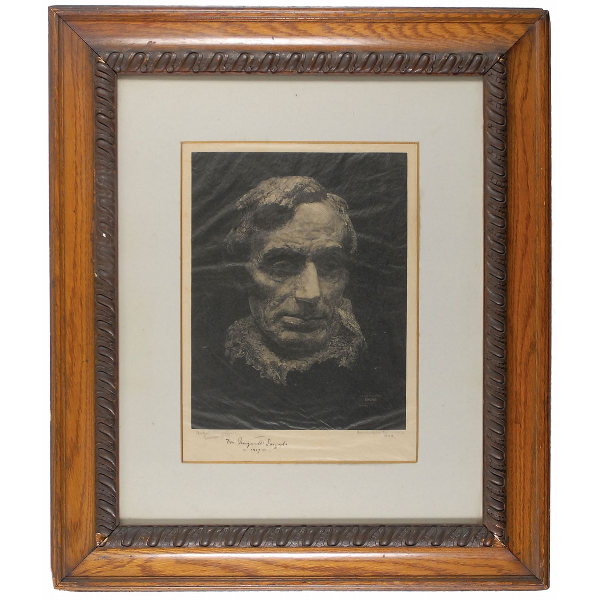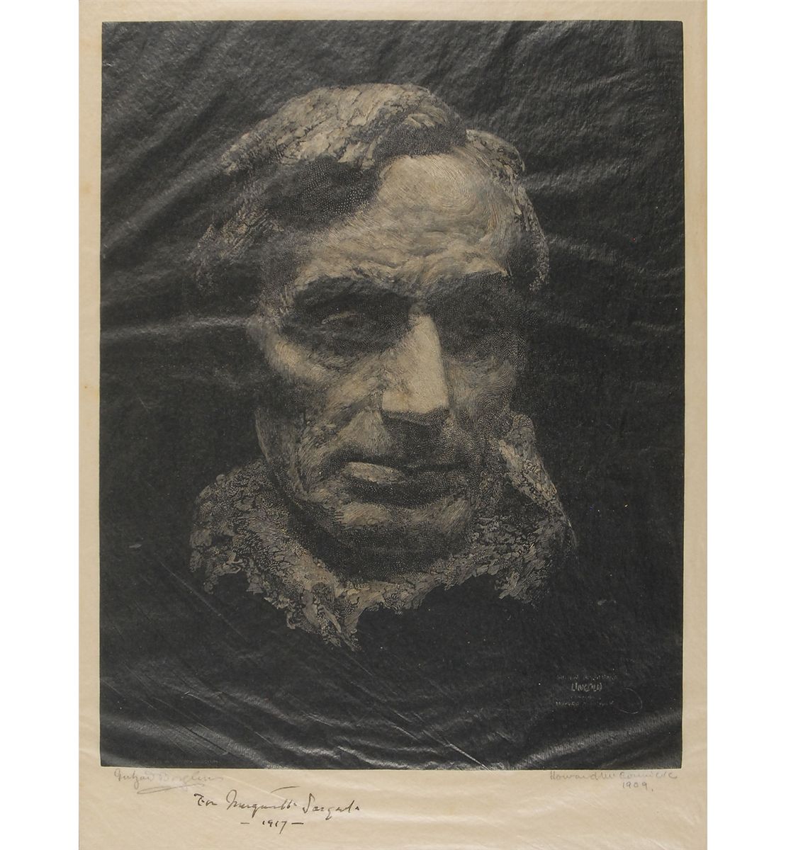 Remarkable engraved portrait on tissue paper of Borglum’s celebrated bust of Abraham Lincoln, 10 x 13.5, signed in the lower border in pencil by Borglum, “Gutzon Borglum,” and by the engraver, “Howard McCormick, 1909.” Additionally inscribed in black ink by Borglum, “For Margarett Sargent, 1917.” Matted and framed to an overall size of 21.5 x 25. Overall wrinkling, otherwise fine condition. Oversized. The engraver, Howard McCormick, was an illustrator who had worked for many of America’s most popular magazines; he took up wood engraving in 1907, leading somewhat of a revival in the once popular technique. Borglum’s colossal marble bust, named ‘The Head of Lincoln,’ was carved from a six-ton block of stone and first exhibited in Theodore Roosevelt’s White House, now on display in the Capitol rotunda. Margarett Sargent, a fourth cousin of noted artist John Singer Sargent, studied under Borglum and worked as an assistant at his art studio between 1917 and 1920. Her life and relationship with Borglum are detailed in the recent biography The White Blackbird, written by her granddaughter. A highly desirable piece with several wonderful associations.