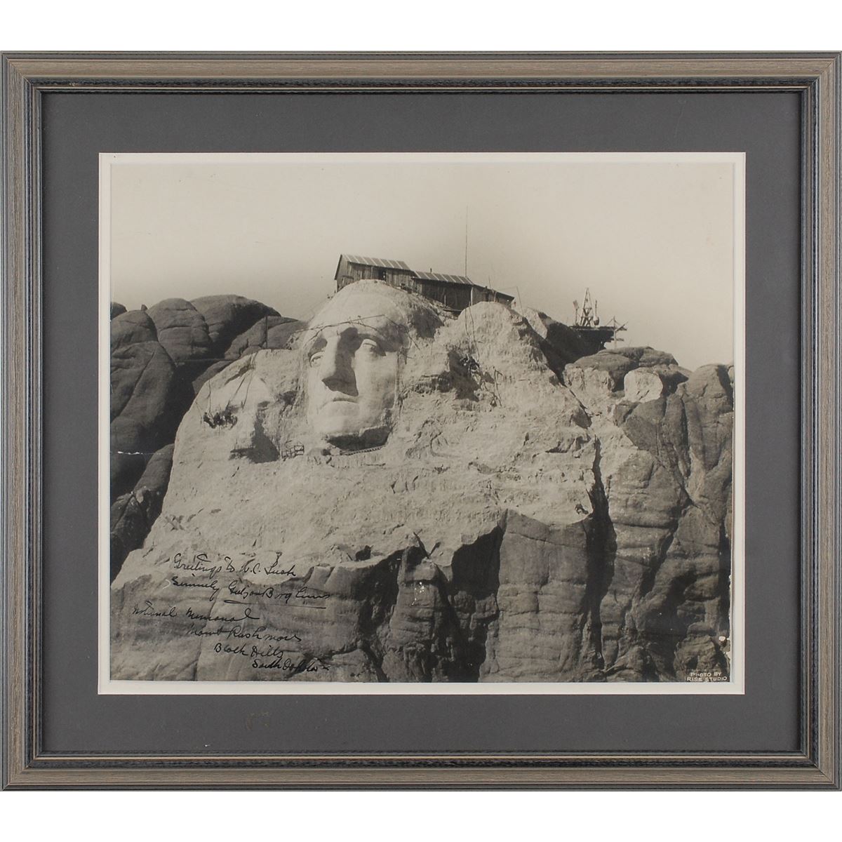 Fantastic matte-finish 16 x 13 photo of Mount Rushmore under construction as George Washington’s face is completed, signed and inscribed in fountain pen, “Greetings to W. C. Lusk, Sincerely, Gutzon Borglum. National Memorial, Mount Rushmore, Black Hills, South Dakota.” Double-matted and framed to an overall size of 22 x 19. In very good condition, with a tear to the left edge, scattered creases, and a few specks of surface loss. W. C. Lusk was a newspaperman who owned the Yankton Press and Dakotan. An appropriately large photograph of the immense sculpture in progress.