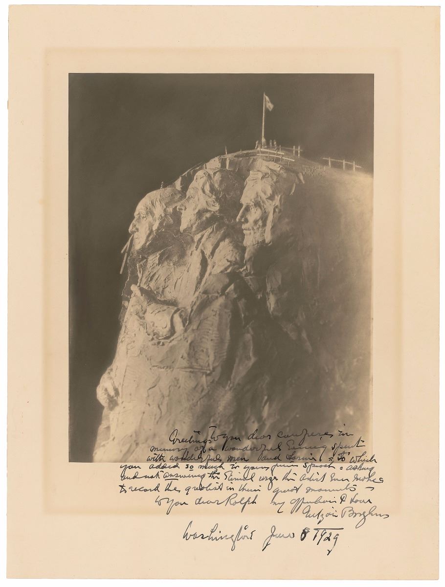 Extraordinary matte-finish 10.25 x 13.5 photo of an early clay model of Mount Rushmore, thoughtfully signed and inscribed in fountain pen, “Greetings to you dear confreres in memory of a wonderful Evening spent with wonderful men and Lorine—to which you added so much to your fine speech—asking and not answering the Eternal urge this artist ever makes to record the greatest in their great moments—to you dear Ralph my affection & love, Gutzon Borglum, Washington, June 6, 1929.” In fine condition.