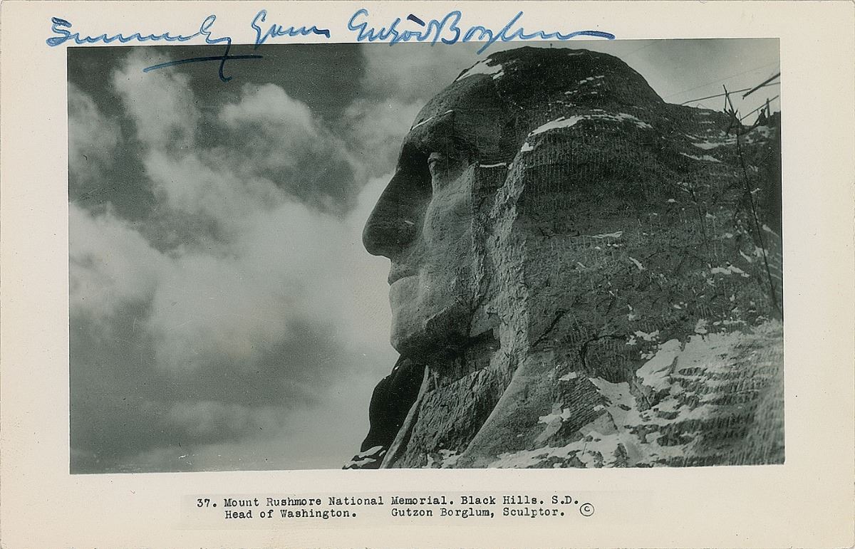 Postcard showing the head of President Washington on the Mount Rushmore National Monument, 5.5 x 3.5, signed in the upper border in fountain pen, “Sincerely from, Gutzon Borglum.” In fine condition. An attractive, seldom-seen format.