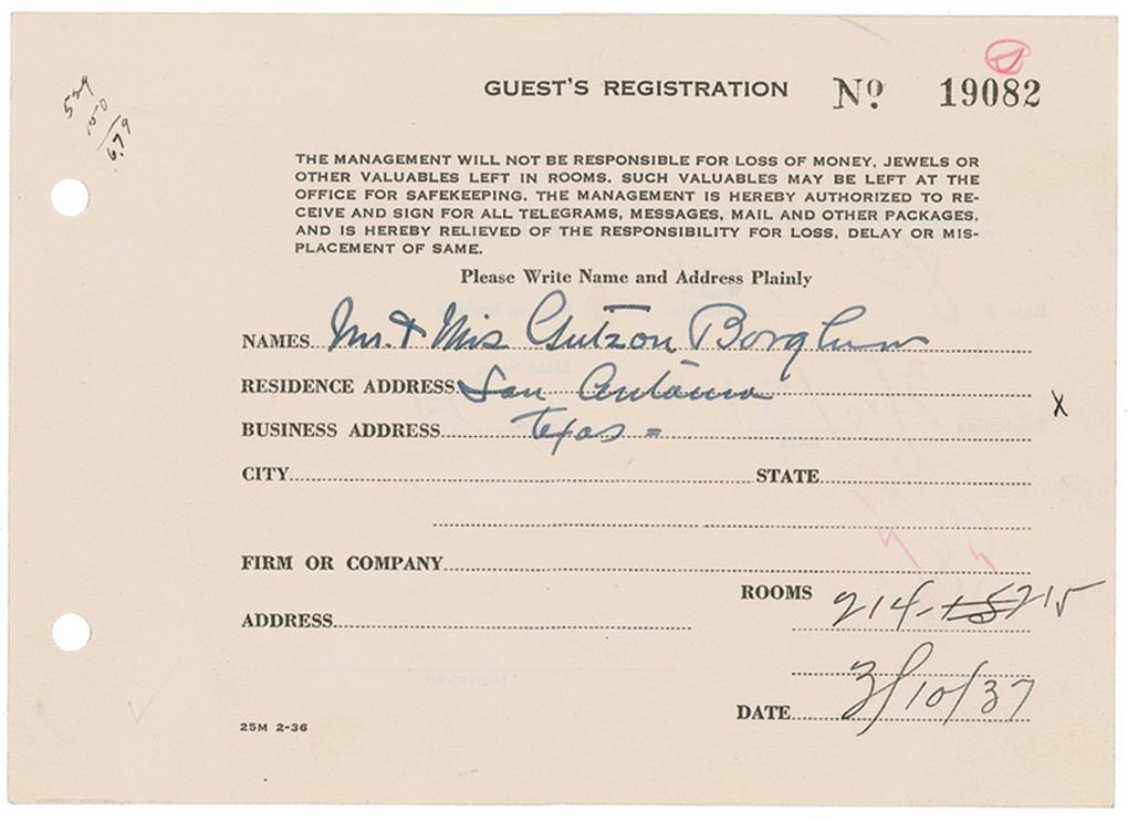 Distinguished American sculptor (1867–1941) best known for his monumental depiction of four presidents on Mount Rushmore. DS, one page, 7 x 5, March 10, 1937. Hotel registration form, filled out by Borglum, “Mr. & Mrs. Gutzon Borglum, San Antonio, Texas.” Date and room assignment is completed in another hand at lower right. In fine condition, with a couple small pencil and ink notations, and punch holes to left edge.
