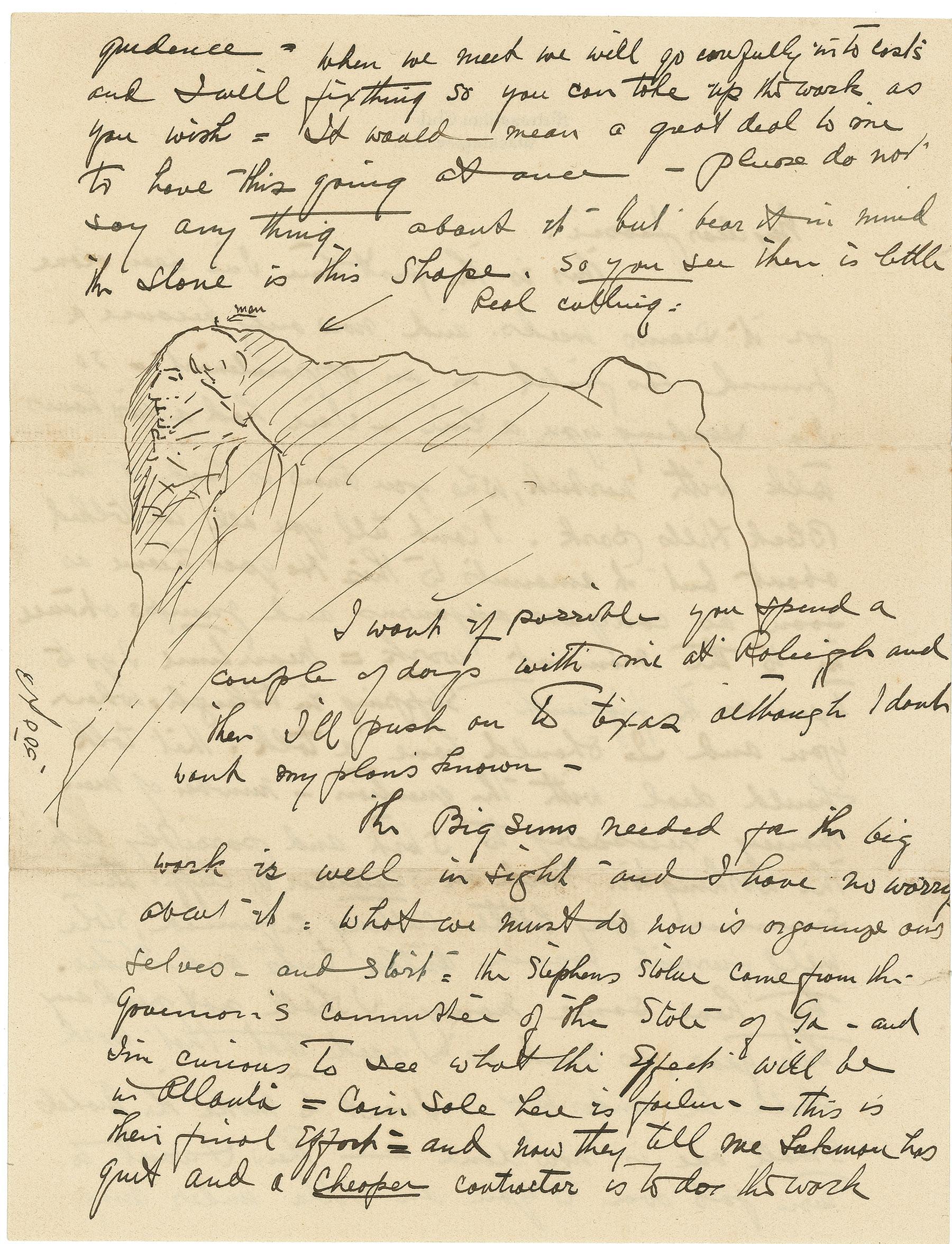 Very little cutting required, state will furnish power drills, tents and studio. They have some money = I shall not need any this year, as much as I need that work shall be under way. I want to make the models small one is now done - Then I want to turn the job over to you or Villa under my guidance. When we meet we will go carefully into costs and I will fix things so you can take up the work as you wish. It would mean a great deal to me to have this going at once - please do not say anything about it but bear in mind the stone is this shape. So you see there is little real cutting. [Borglum has then sketched Mount Rushmore and the bust of George Washington with a tiny “man” on top of it]