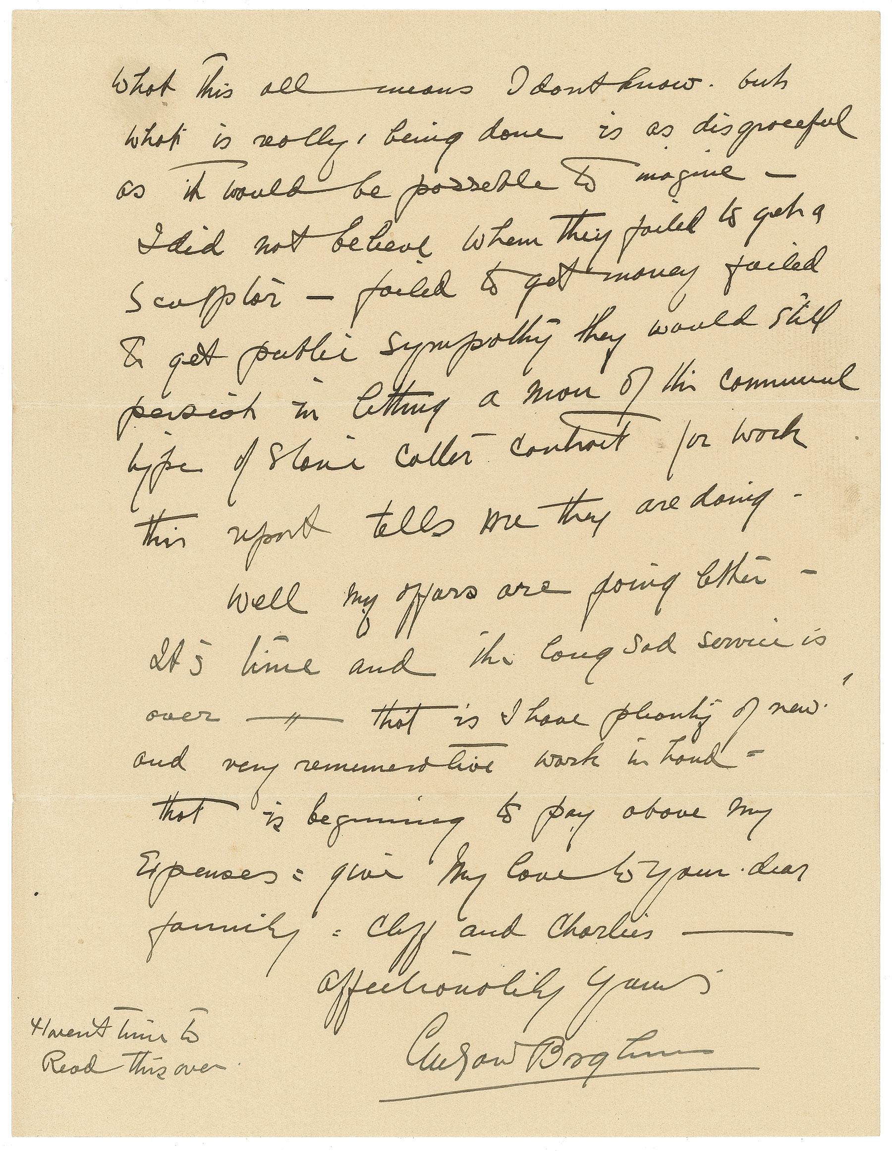 What this all means I don’t know - but what is really being done is as disgraceful as it would be possible to imagine - I did not believe when they failed to get a sculptor - failed to get money - failed to get public sympathy they would still persist in letting a man of this commercial type of stone cutter contract for work this report tells me they are doing wrong. Well my affairs are going better - It’s time and the long sad service is over—that is I have plenty of new and very rememrative work in hand = that is beginning to pay above my expenses = give my love to your dear family.” In fine condition, with light soiling and writing lightly showing through from opposing sides. Accompanied by a typed transcript of the letter and a custom portfolio.