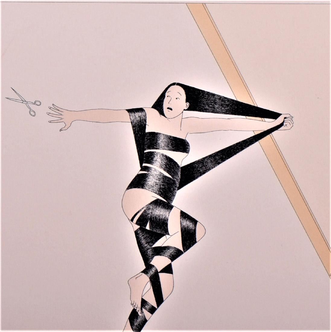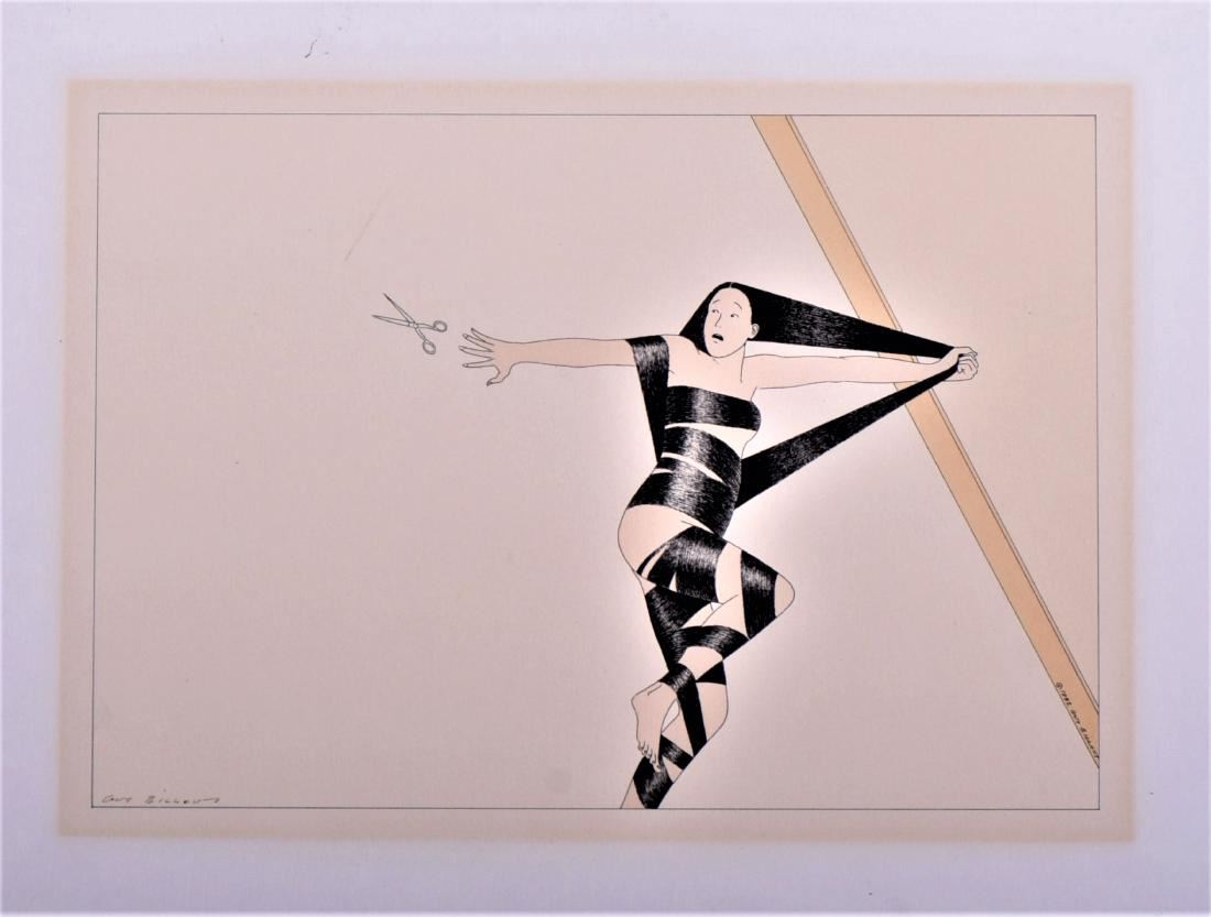 Guy Billout (1941-), French Artist, signed original pen and watercolor. Extremely rare modernism image for this well listed artist. Asian hair bondage, a young Asian lady struggles to reach a pair of scissors to free herself. Size of image 10 x 7 inches Estimated less than 50 yrs old. Fine Art. Size and/or Weight: See Measurement Photo. (Photos Represent The Lot Condition. Read T&C's)