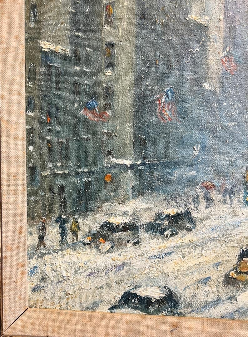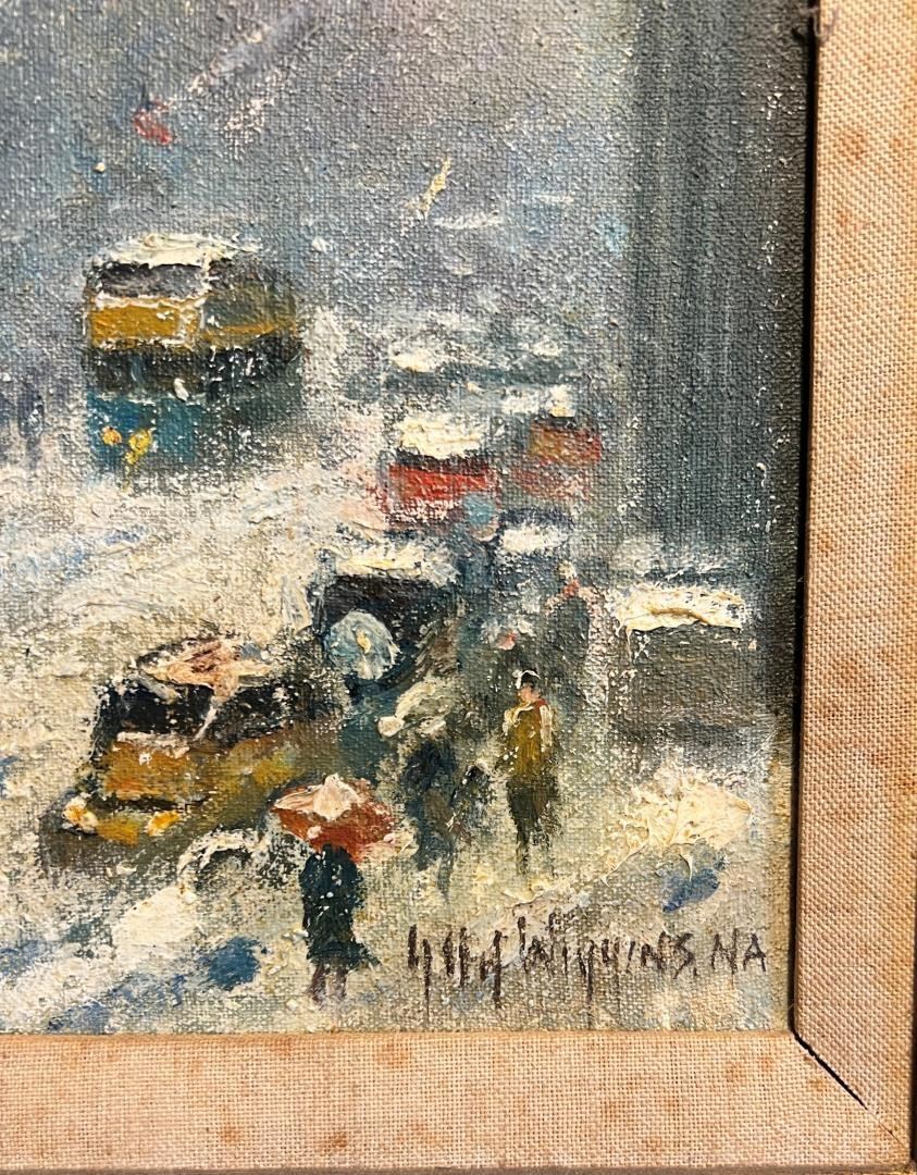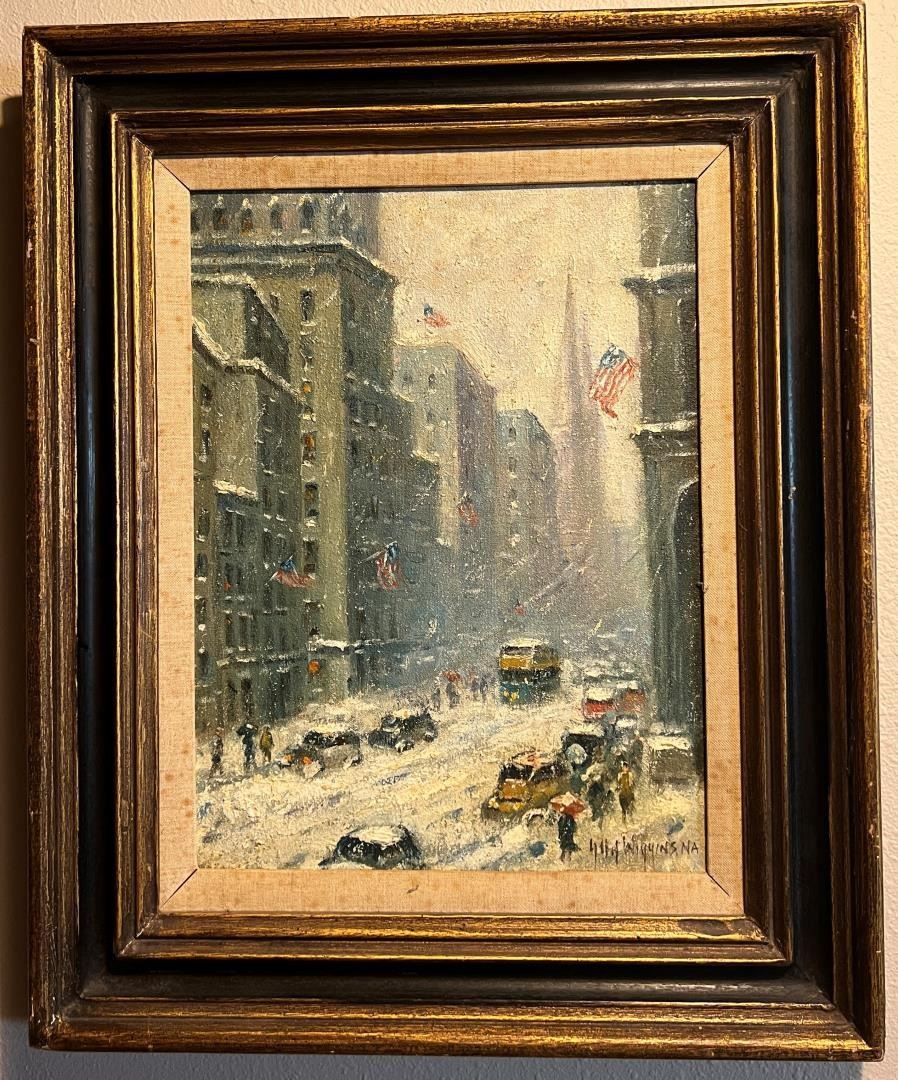 Oil on Canvas. Painting itself measures 12" by 16", and 18.5" by 22.5" framed. Image Depicts the Intersection of Williams and Wall Street in Winter. Signed Guy Wiggins NA. The work could benefit from a cleaning. The frame exhibits rubbing as shown. Clean under UV light with no restoration. Guy Carleton Wiggins (1881-1962) is best known for his impressionistic snow scenes of New York in 1920's. Wiggins lived in Old Lyme and Essex where he operated an art school. The Connecticut country-side was conducive to his impressionist technique of plein-air painting and broken brushwork. Guy Carleton Wiggins had a long and successful career as an Impressionist artist and teacher in New York and Connecticut, but he once told his son (also an artist named Guy) "painting is a wonderful hobby, but a damned difficult way to make a living." (Perhaps he was thinking of the way he had sent his son through Loomis Chaffee School in Windsor with a series of paintings.) Ironically, although his work includes many fine Connecticut landscapes, he is best remembered for some snow scenes of New York City. Like many other American Impressionists, Wiggins had one foot in the city and the other in the country (Vermont Hillside, South Londonderry). Wiggins was born in Brooklyn, New York, went to England with his family as a boy, received an English grammar school education, and traveled widely abroad. He was the son of a prominent artist, Carleton Wiggins, a painter in the Barbizon style who studied with George Inness and admired Anton Mauve and Dwight Tryon. The father and his family had been early and regular visitors to the Old Lyme Colony, and the elder artist had settled in Lyme permanently by 1915, where he was active in the Lyme Art Association and in the social life of the colony. Carleton Wiggins' palette had brightened under the influence of Old Lyme Impressionism, but in general his work remained tonal and his subjects were truly pastoral, his paintings often of sheep in a meadow. The son, by contrast, became strongly attracted to Impressionism and stayed with it long after it was considered outmoded. Eventually in 1920, he and his family also settled in Lyme. Some twenty years later he relocated in Essex. For a time Wiggins had some serious training as a draftsman, for he studied architecture at Polytechnic Institute in Brooklyn, perhaps to avoid competing with his father as an artist. His art talent had manifested itself early and stunningly. He had been only eight years old when New York critics publicly praised some watercolors done in France and Holland. Soon his interest in art exceeded that in architecture, and he studied at the National Academy of Design, first under William Merritt Chase and later under Robert Henri. Wiggins quickly won recognition. By the time he was twenty he had a work in the permanent collection of the Metropolitan Museum of Art. He was elected to full membership in the National Academy of Design in 1919. Awards came steadily, such as the prestigious Norman Wait Harris Bronze Medal from the Art Institute of Chicago in 1917. His prize list is long. Wiggins was especially busy in the years before World War I, working on commissions from New York patrons for scenes painted "on location (Morning, Gloucester) " in England (he met his wife on one of these trips), but he found time to be at Old Lyme and exhibit there, and he became involved as well with the Connecticut Academy of Fine Arts, established in 1910. He showed "Building the Ship, Noank" in the premier exhibition, and for the second annual exhibition, in which he entered another Noank scene, he was on both the jury and the hanging committee. Subsequently, besides being a juryman, he won prizes in Academy exhibitions and served as president (beginning in 1927 into the 1930s). He also belonged to the New Haven Paint and Clay Club. By 1920 Wiggins had decided to make his home on an old farm in Hamburg Cove, a picturesque area in Lyme Township. He still spent time in New York, and most of his New York snow scenes probably date from the early 1920s. In an interview published in the Detroit News in 1924 (specific date unknown), he talked about these pictures: "One cold, blustering, snowy winter day (1912) I was in my New York studio trying to paint a summer landscape. Things wouldn't go right, and I sat idly looking out of a window at nothing. Suddenly I saw what was before me---an elevated railroad track, with a train dashing madly through the whirling blizzard-like snow that made hazy and indistinct the row of buildings on the far side of the street ("Metropolitan Tower, 1912" Metropolitan Museum, NY). Well, when I gave an exhibition a short time afterward . . . the winter canvases were sold before anything else. In a week, so to say, I was established as a painter of city winter scenes, and I found it profitable. Then suddenly I felt a revulsion against them and I stopped. Everyone said I was a fool and was shutting the door upon opportunity, maybe fame. Just the same I couldn't go on with winter stuff and that was all there was to it. Although he spoke of the New York pictures as though they were history, he sometimes again felt the urge "to brush up a little snow" in order to pile up a little cash. Indeed, he may have changed his attitude completely, for he also once told someone that New York during a snowfall was his favorite subject. But since Connecticut landscapes and New York snow scenes are about equal in number in his work, and comprise most of it, the pastoral quality in parts of our state clearly appealed to Wiggins. Some say the Connecticut landscapes are his best work. In 1930 Wiggins, though he still listed a winter New York address in the American Art Annual, was advertising the "Guy Wiggins Art School: New Haven (winter); Lyme (summer)." Hartford artist James Goodwin McManus often taught the summer classes with him at Hamburg Cove. In 1937, at the age of fifty-four, Wiggins resettled in Essex and moved his art 