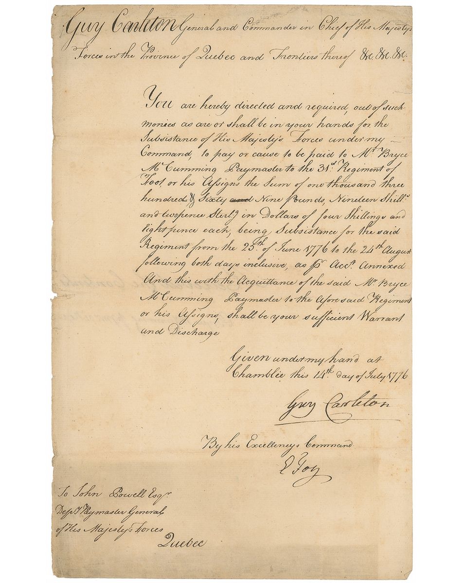 At this time Carleton was commanding British troops in Quebec, having dealt the Americans their first major loss of the war six months earlier in the Battle of Quebec. Just a few weeks before signing this document, Carleton was elevated to knighthood in recognition of his successful defense of the city, which the British believed effectively saved the entire province of Canada from falling. This document also dates to within two weeks of the signing of the Declaration of Independence, a defining moment of the Revolution. It concerns payment of the 31st Regiment of Foot, which was involved in the garrison of Quebec during this historic time. Most notably, the 31st lost a large number of prisoners during the Battle of Saratoga in autumn of the following year. A scarce and exceptional document from an immensely important period of the war.