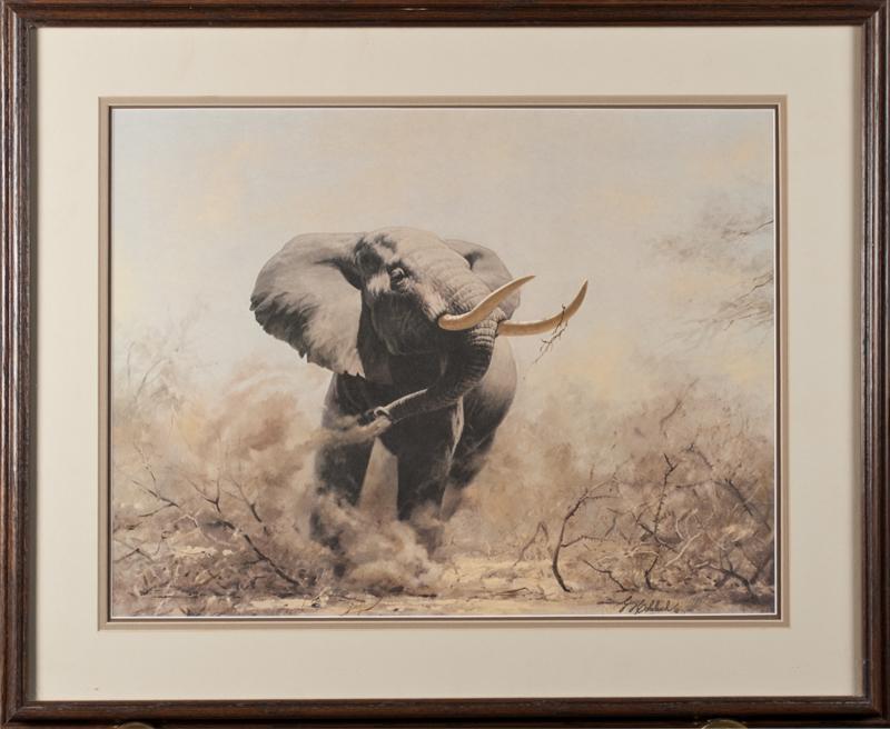 Titled, "Beware," depicting an African Bull elephant. Plate # XXVII, pencil signed LR, nicely framed and matted. 22.25" H x 26.75" W (including frame).