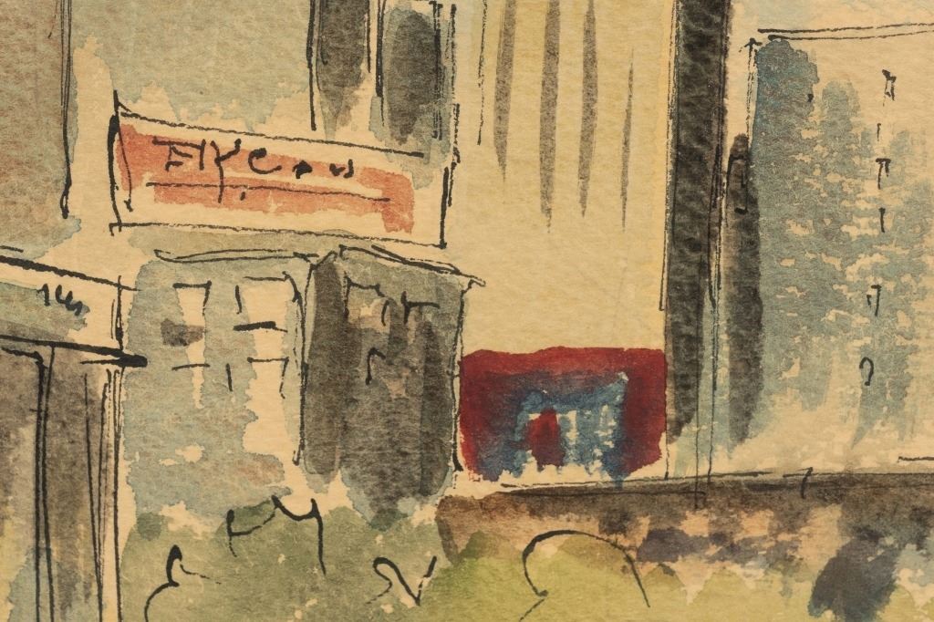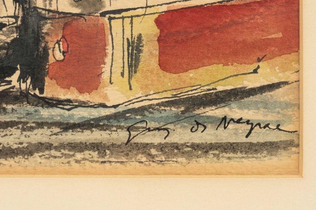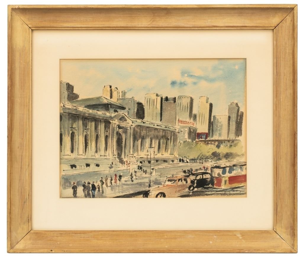 Item/Description: Original watercolor painting. Signed cityscape by French artist, Guy De Neyrac (1900-1950). Iconic New York landmark, New York Public Library at 42nd Street. Bright happy busy bustling street scene. Cabs, trolley car. Artist signed lower right: Guy De Neyrac.