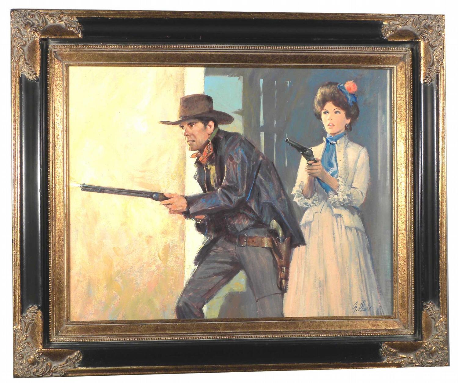 Guy Deel Painting entitled, "Edson's Stand Off". #128 J.T. Edson Western Novel Illustration for cover. Acrylic on board. 14 X 18 inches.